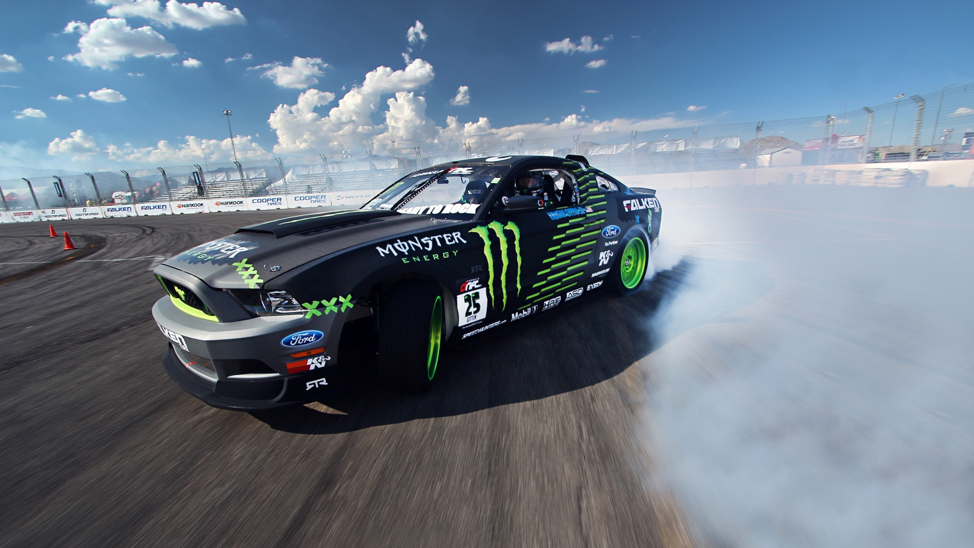 Description: A monster truck driving on a track with smoke coming out of the tires and the front of the car.