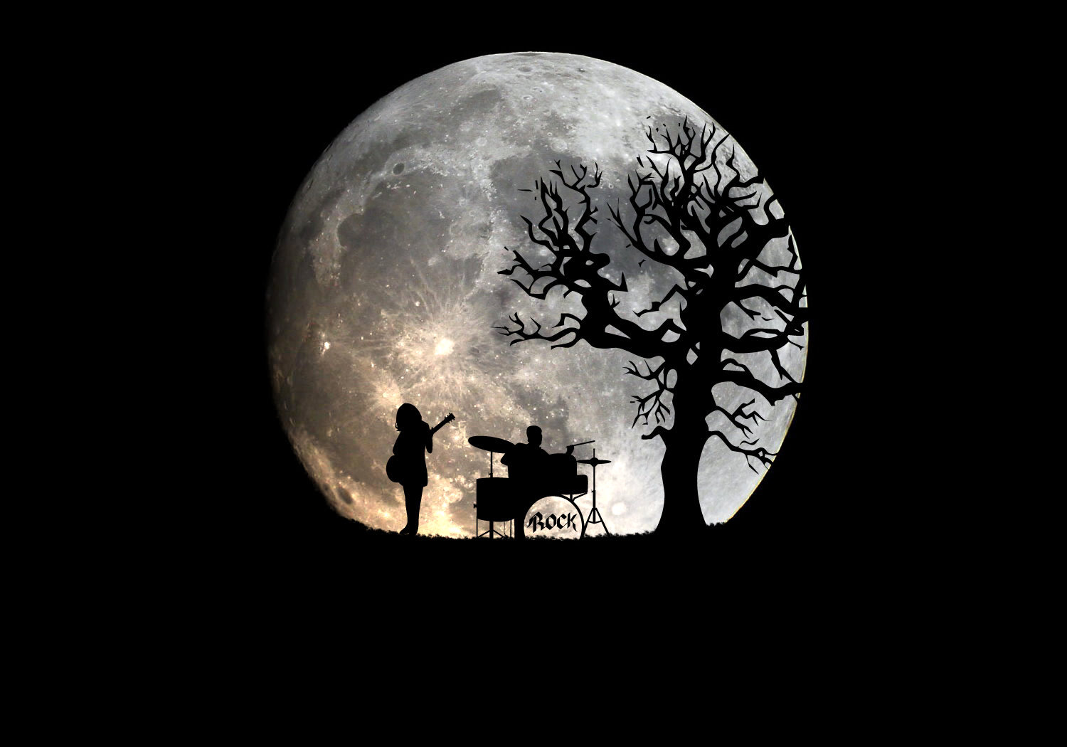 Description: A person standing in front of a full moon with a guitar and a tree in the background with a person standing next to a drum.