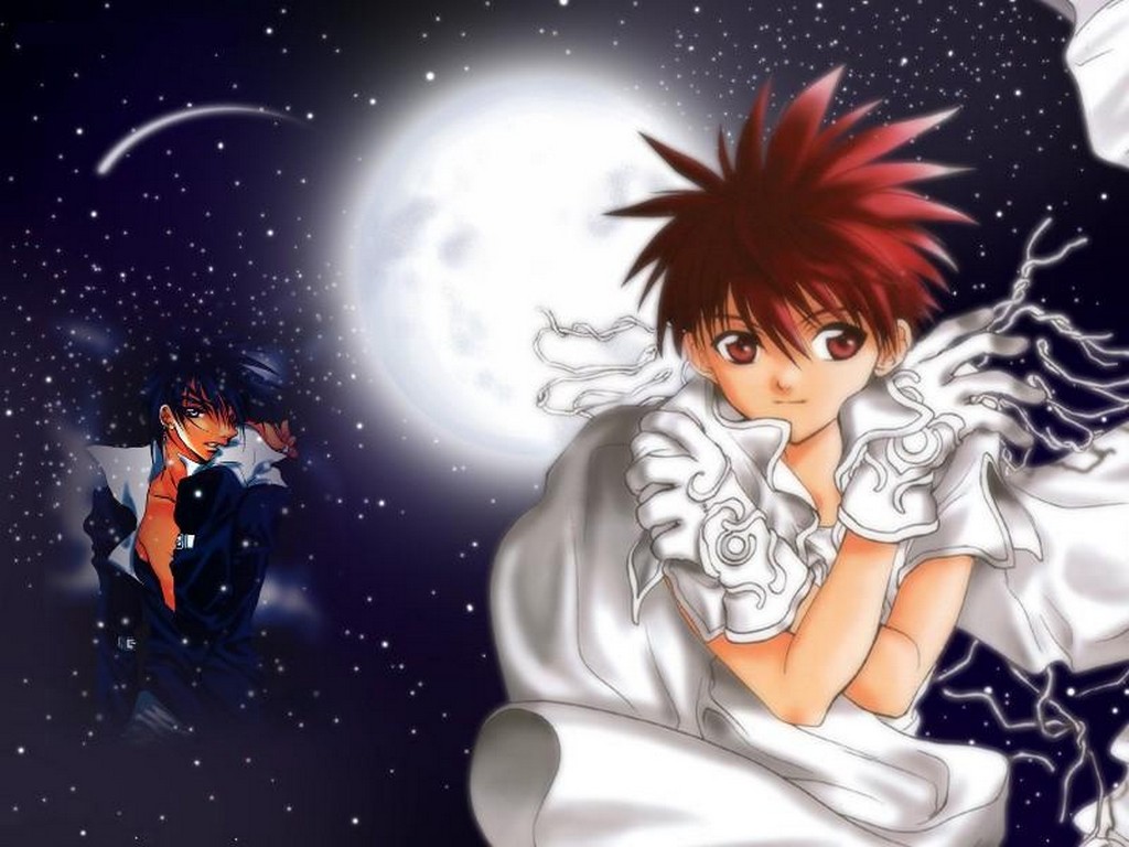 Description: A man and woman in white clothes sitting on a bed in front of a full moon and stars background.