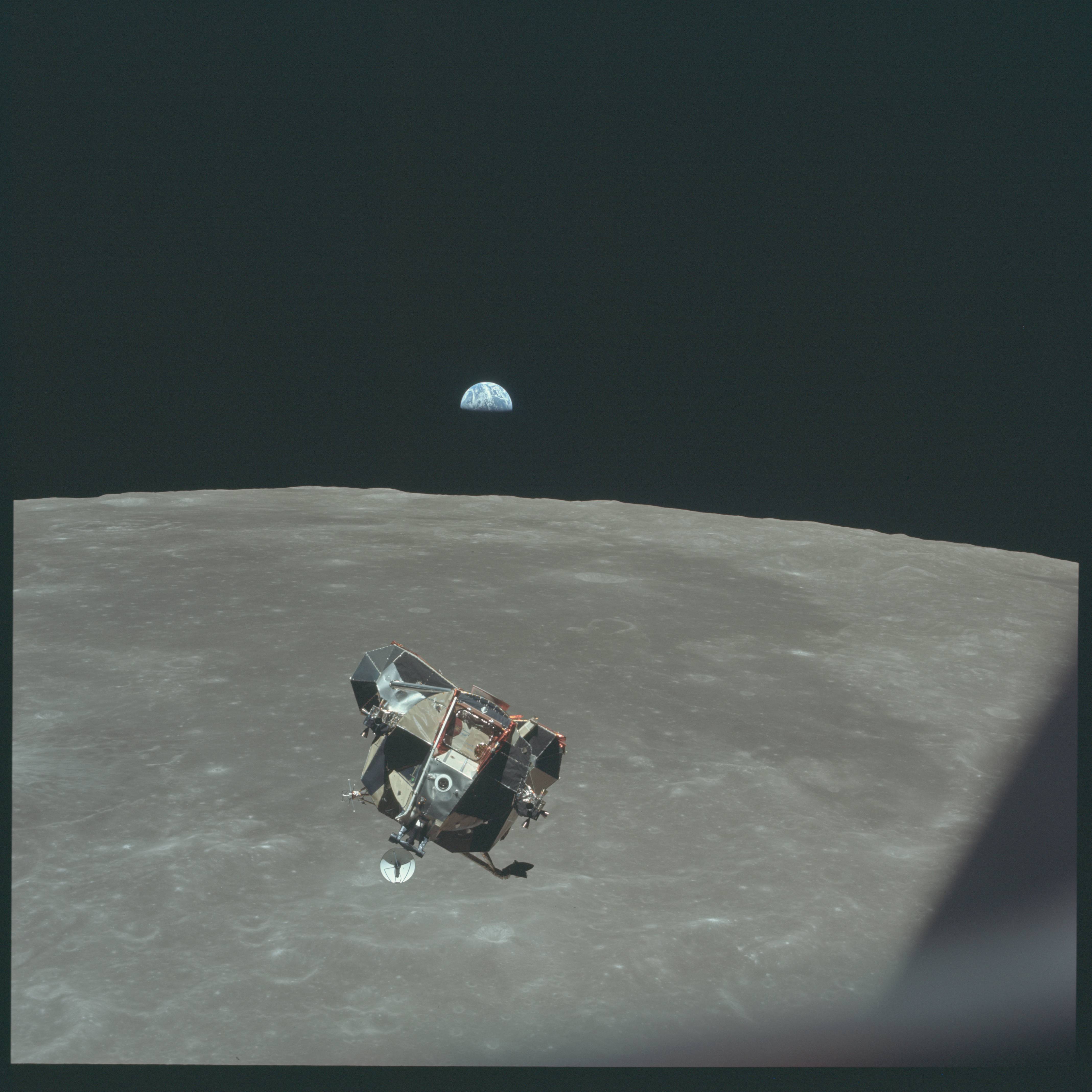 Description: A space station on the moon with a small satellite in the background and a distant object in the distance.