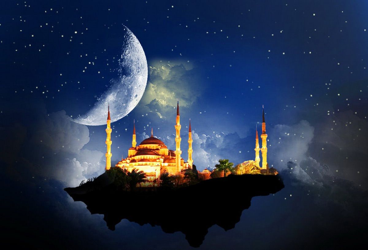 Description: A picture of a mosque on a small island in the sky with a crescent moon in the background and stars in the sky.