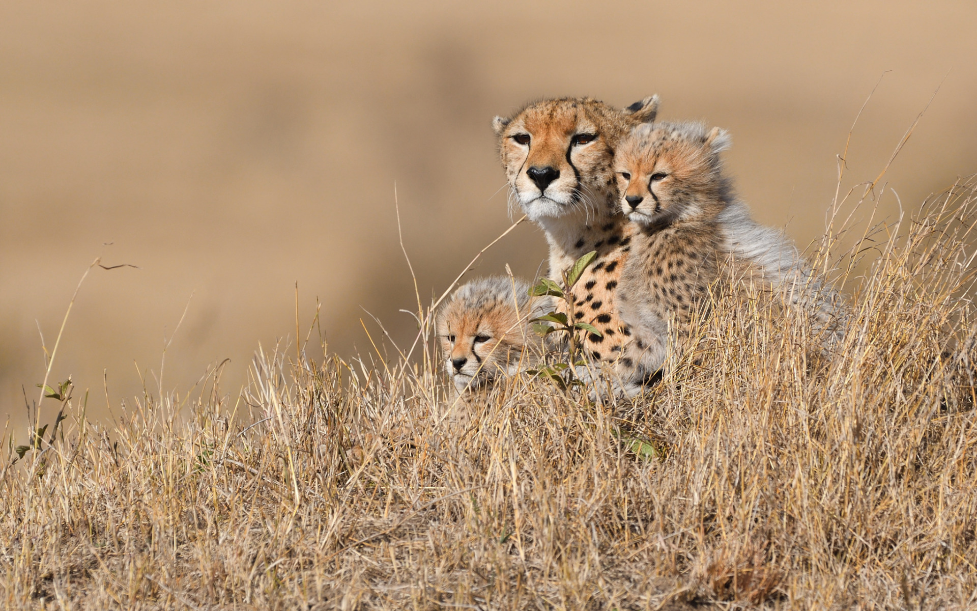 Description: A mother cheetah and her two cubs in a field of dry grass and weeds.