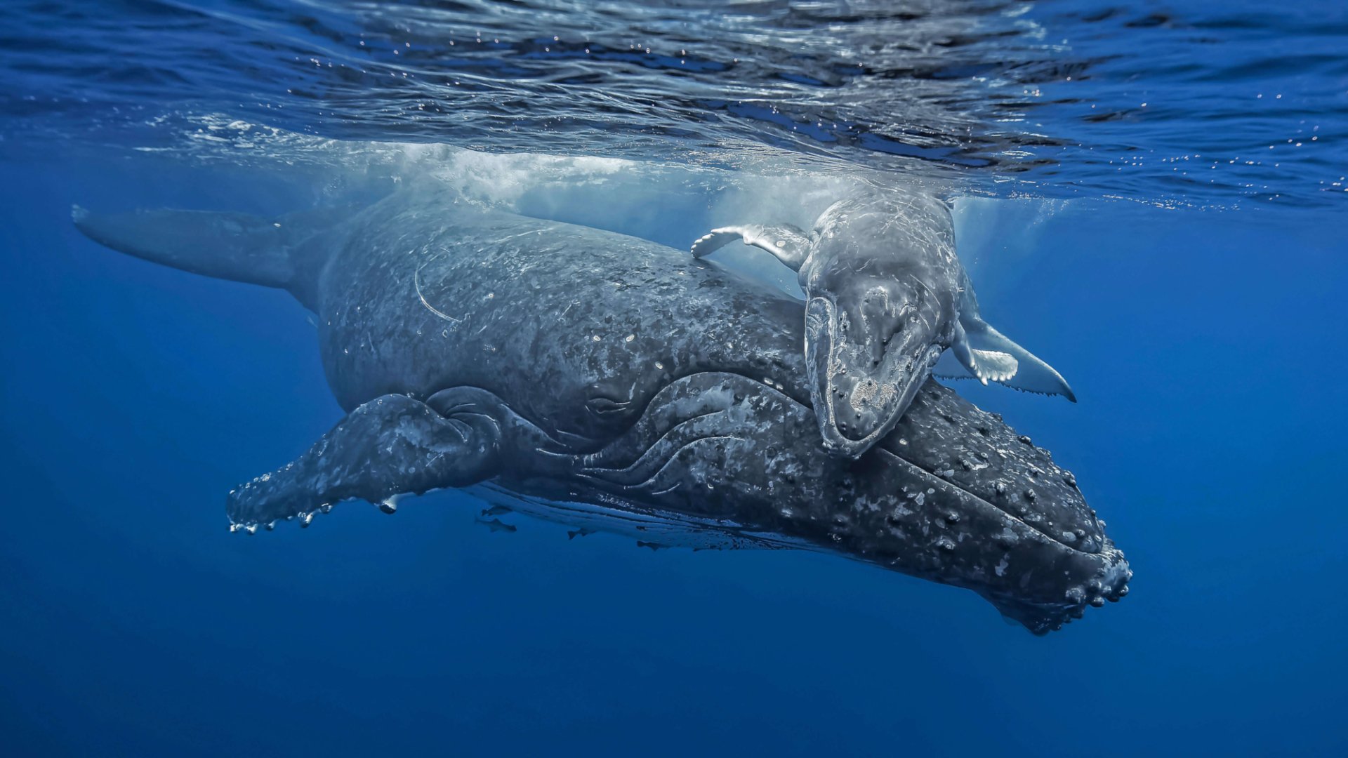 Description: A mother whale and her calf swimming in the ocean together.