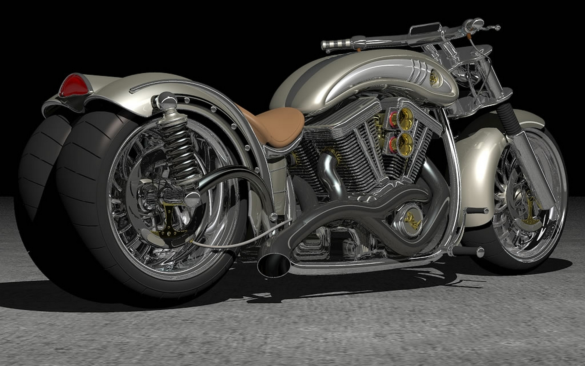 Description: A motorcycle is shown in a 3d image with a black background and a light brown seat and back end.