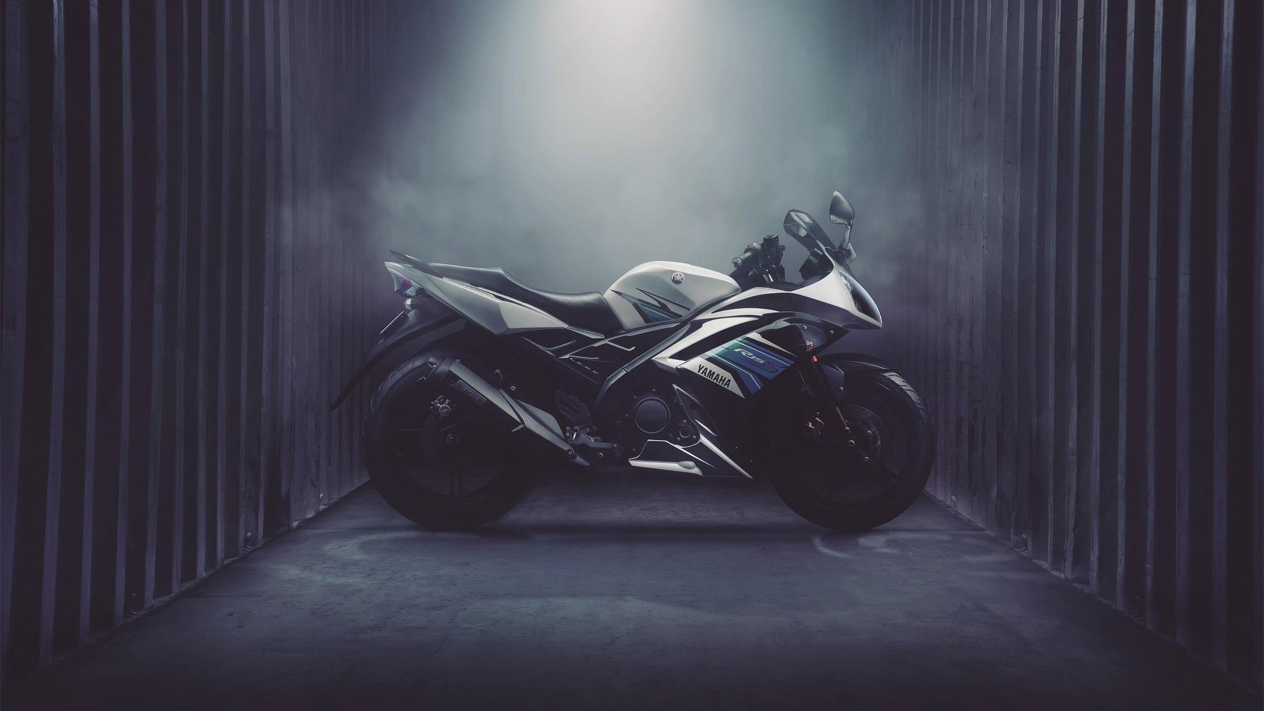 Description: A motorcycle is parked in a dark room with a light on it's side and a foggy background.