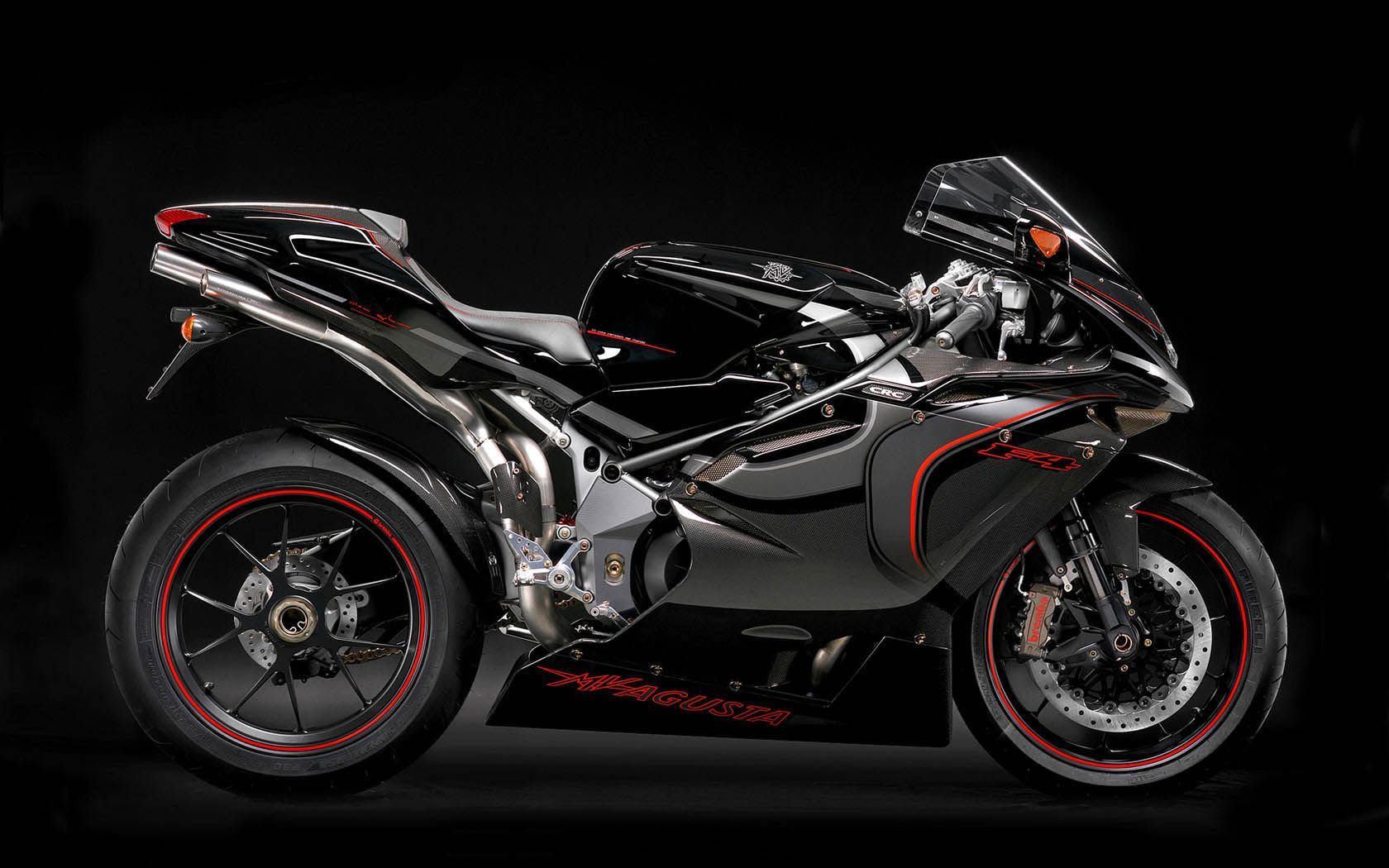 Description: A motorcycle is shown in a dark room with red rims and red tires on it's sides.