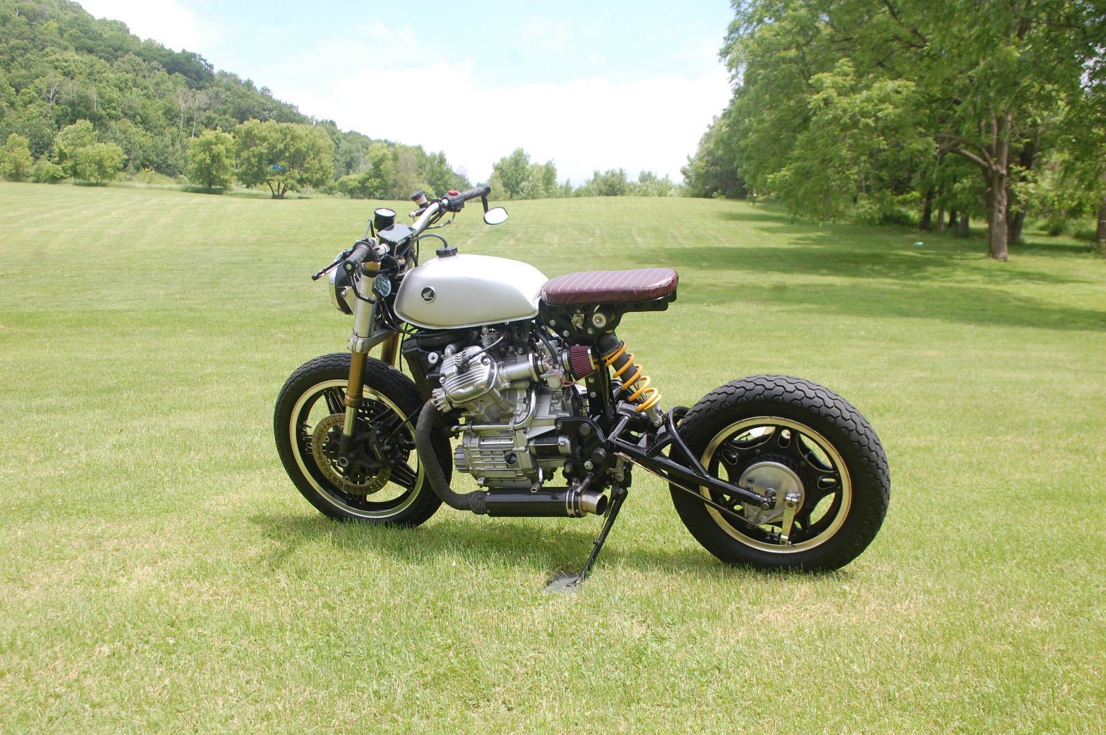 Description: A motorcycle parked on a lush green field next to a forest of trees and grass with a sky background.