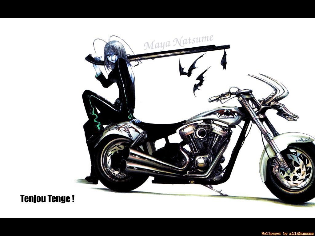 Description: A drawing of a motorcycle with a person on it's back and a bird flying over it's head.