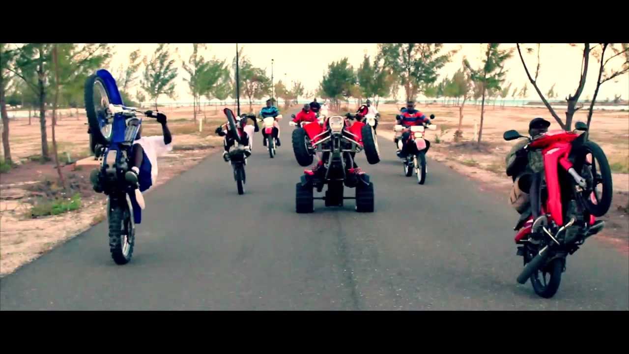 Description: A group of people riding on the back of motorcycles down a road with trees in the background and a person on a motorcycle behind them.