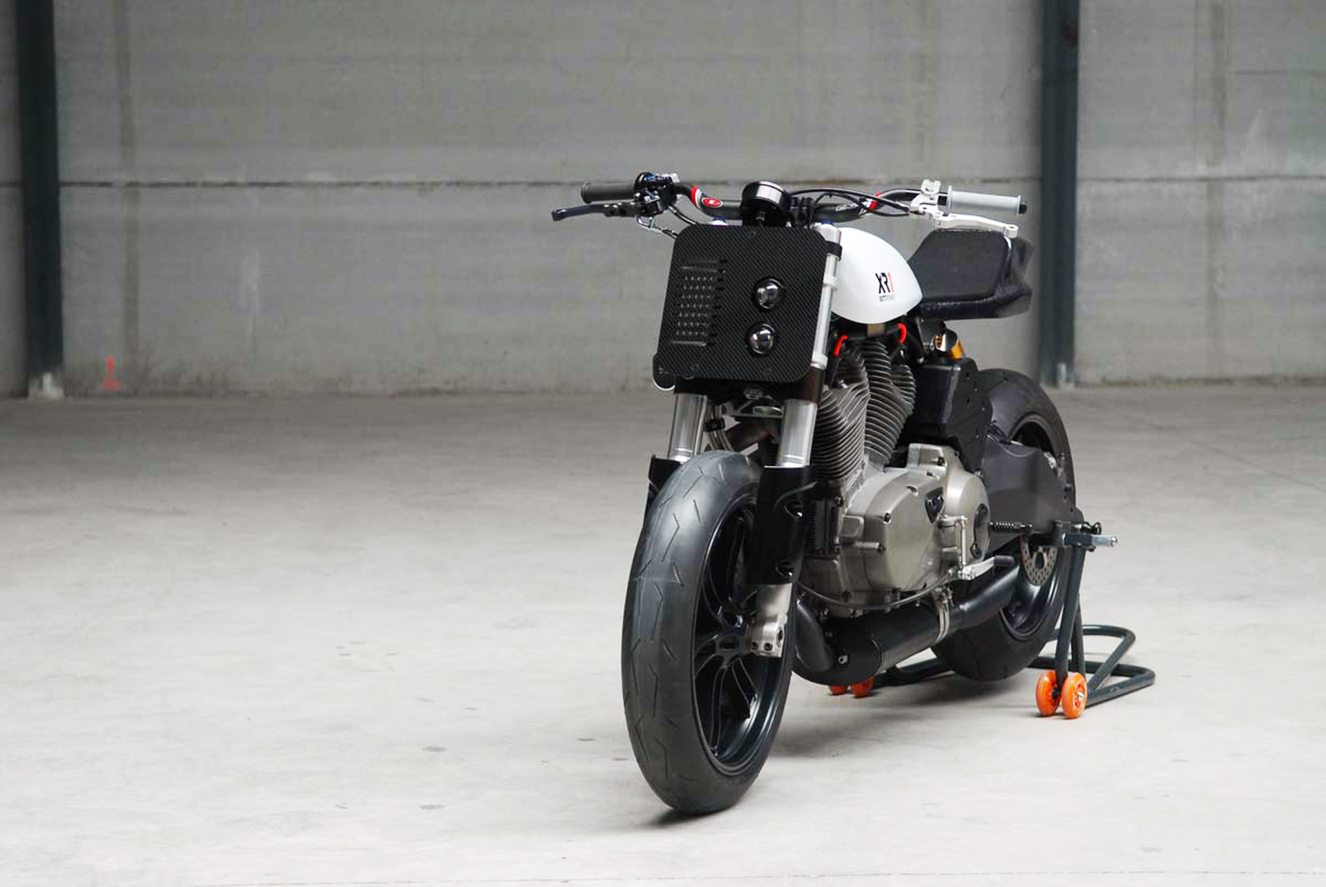 Description: A motorcycle parked in a garage with a wall behind it and a door open to the side of the bike.