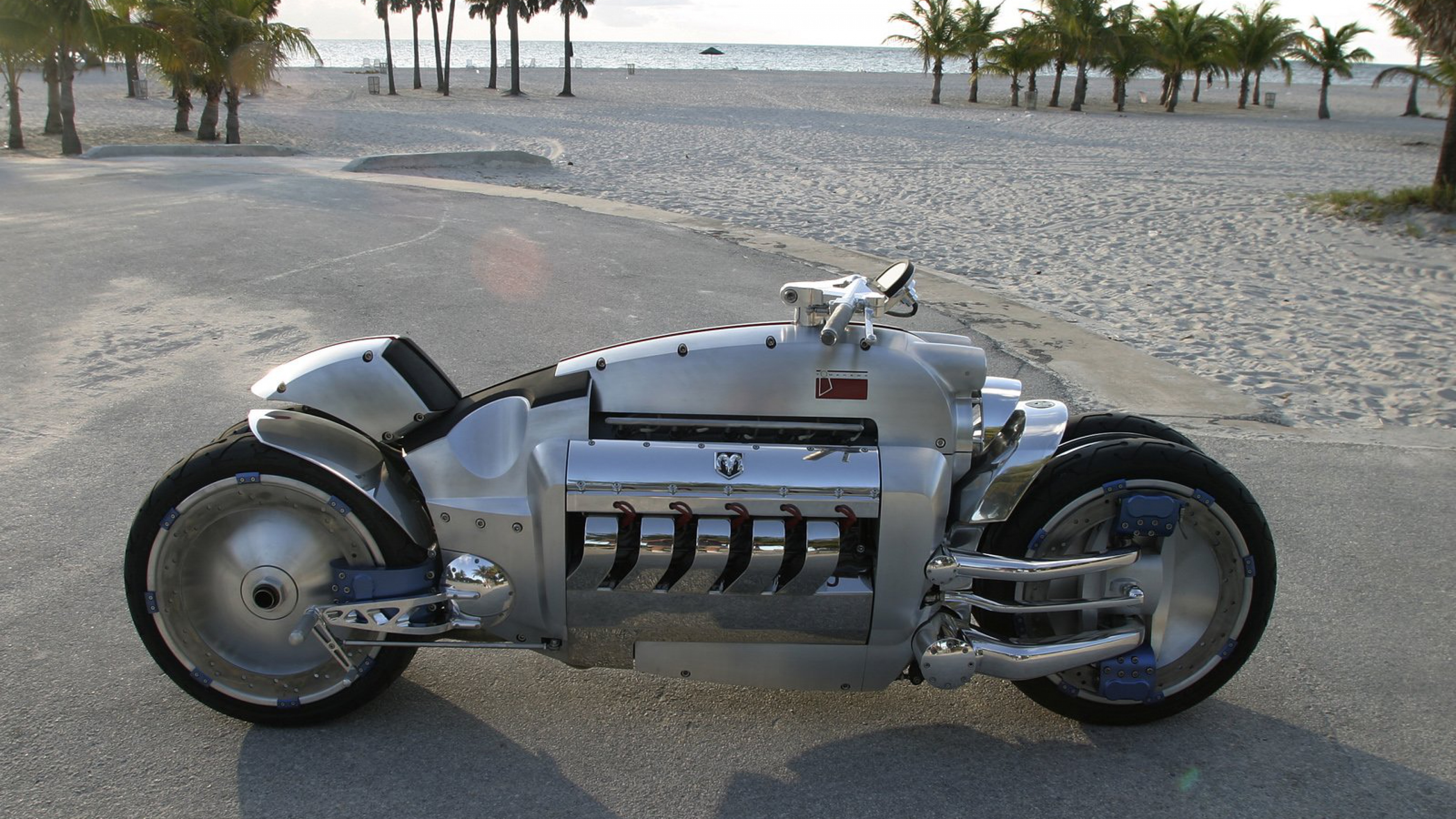 Description: A motorcycle parked on the side of a road near the ocean and palm trees in the background.
