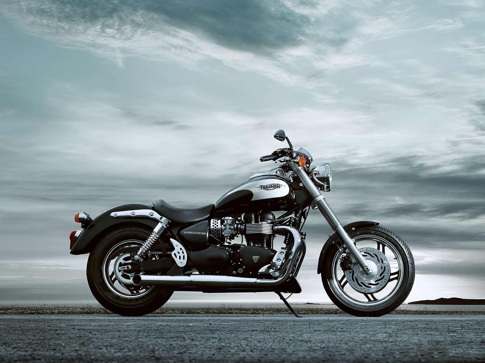 Description: A motorcycle parked on the side of a road under a cloudy sky with clouds in the background and a black and white photo.