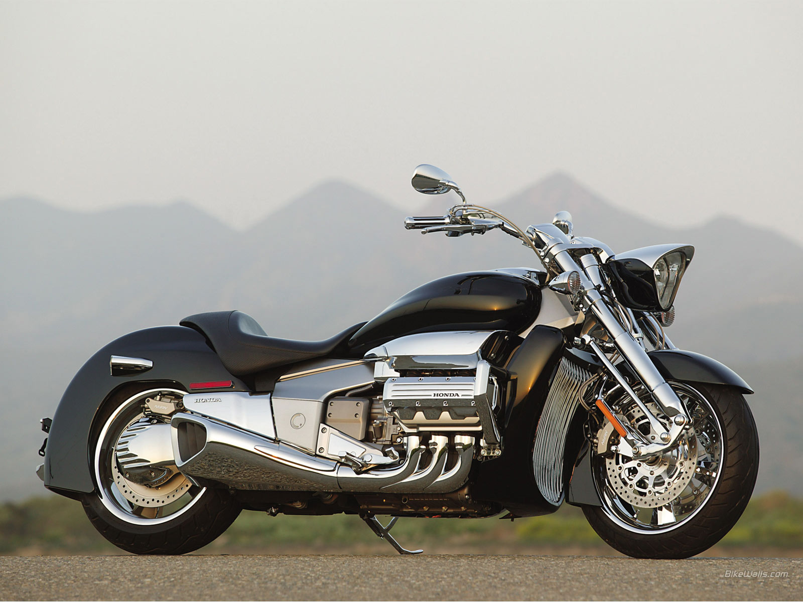 Description: A motorcycle parked on a road with mountains in the background and a sky background with clouds in the sky.
