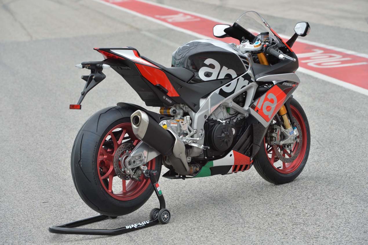 Description: A motorcycle is parked on a track with a red tire guard on it's side and a red and white number 66 on the front tire.