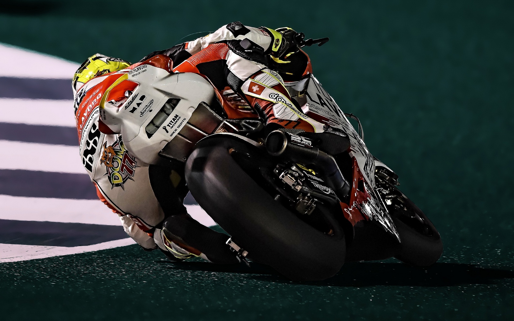 Description: A person on a motorcycle on a race track with a helmet on and a helmet on and a helmet on.
