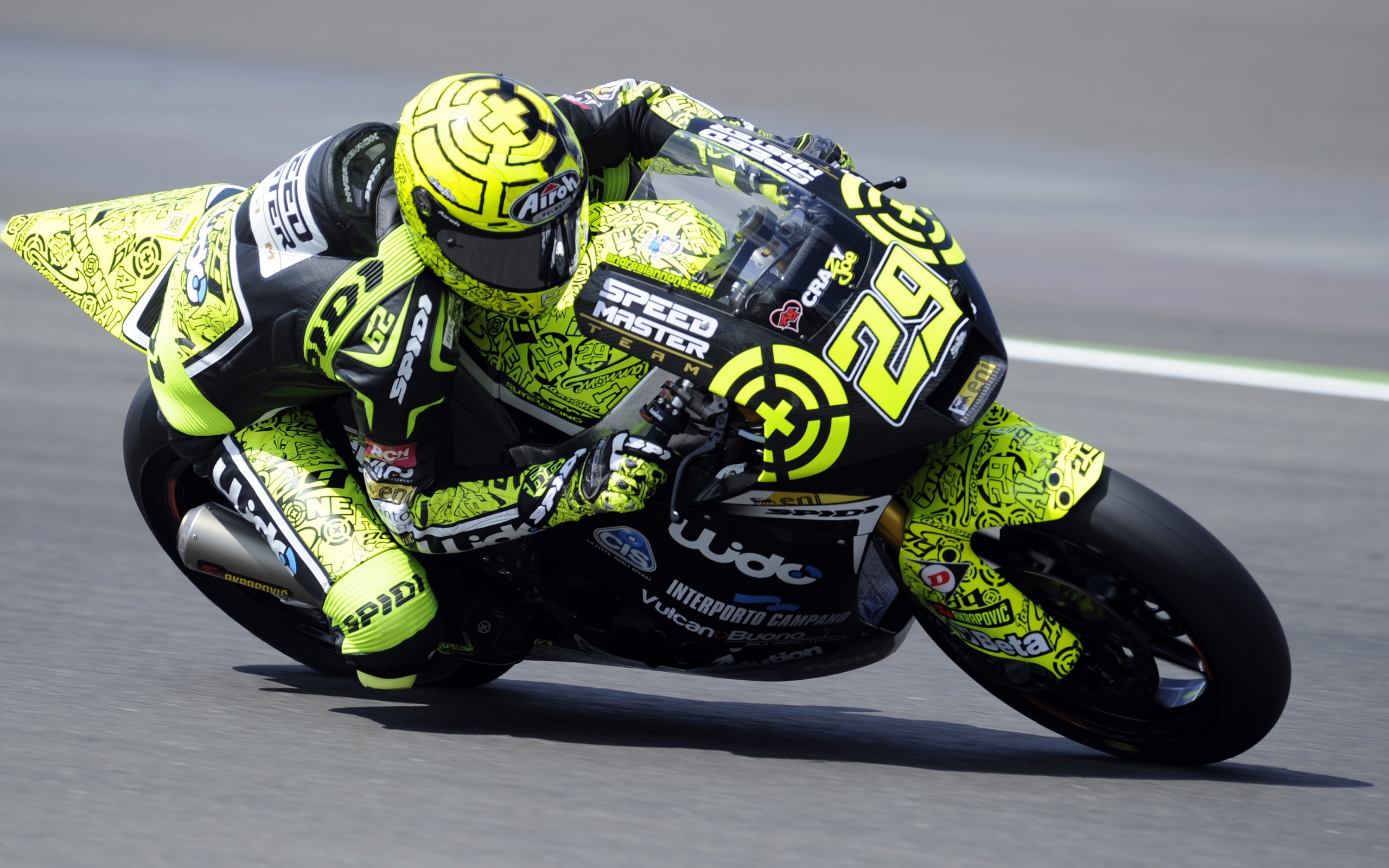 Description: A person on a motorcycle on a race track with a helmet on and a helmet on and a helmet on.