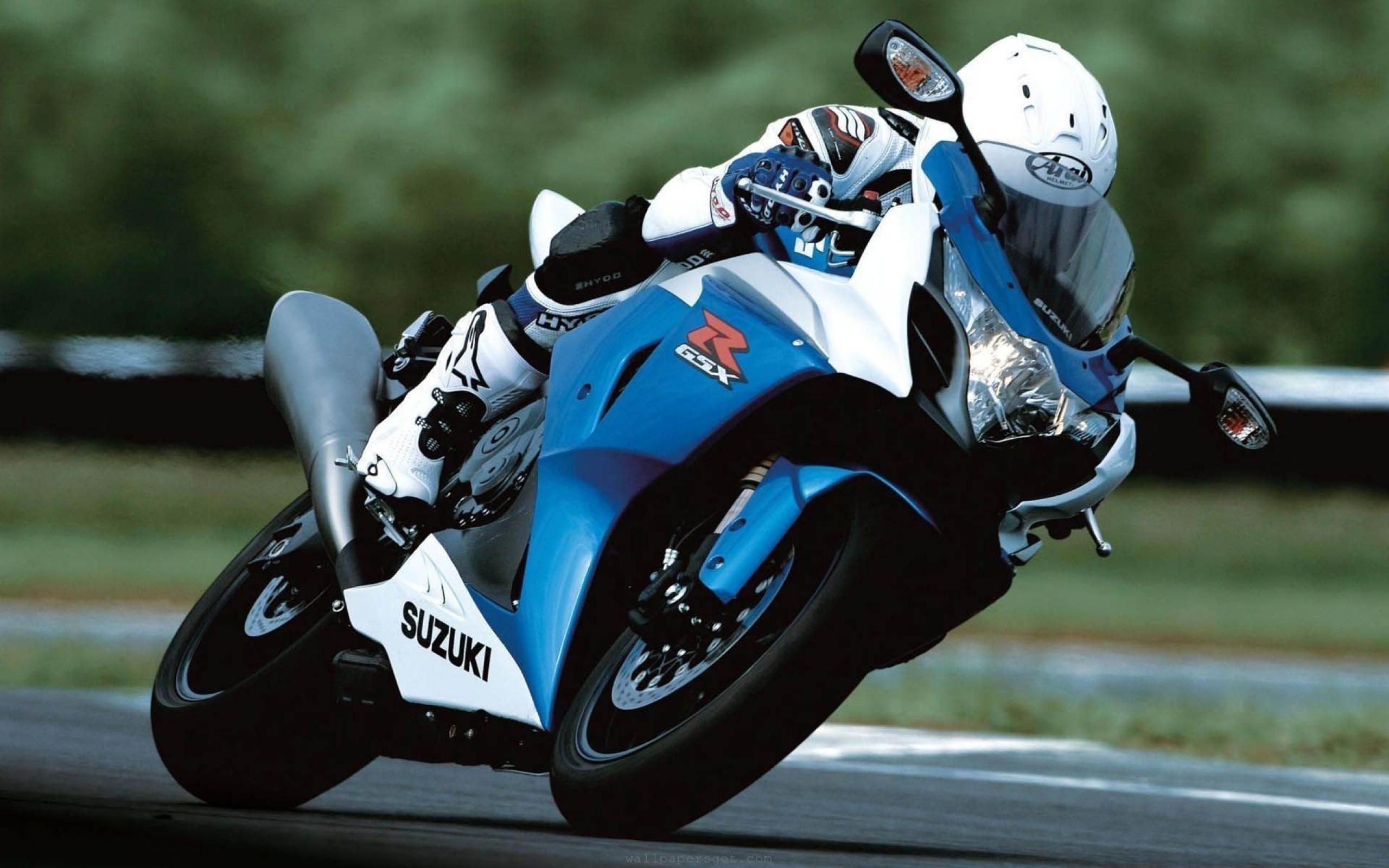 Description: A person riding a motorcycle on a race track with trees in the background and grass in the foreground.