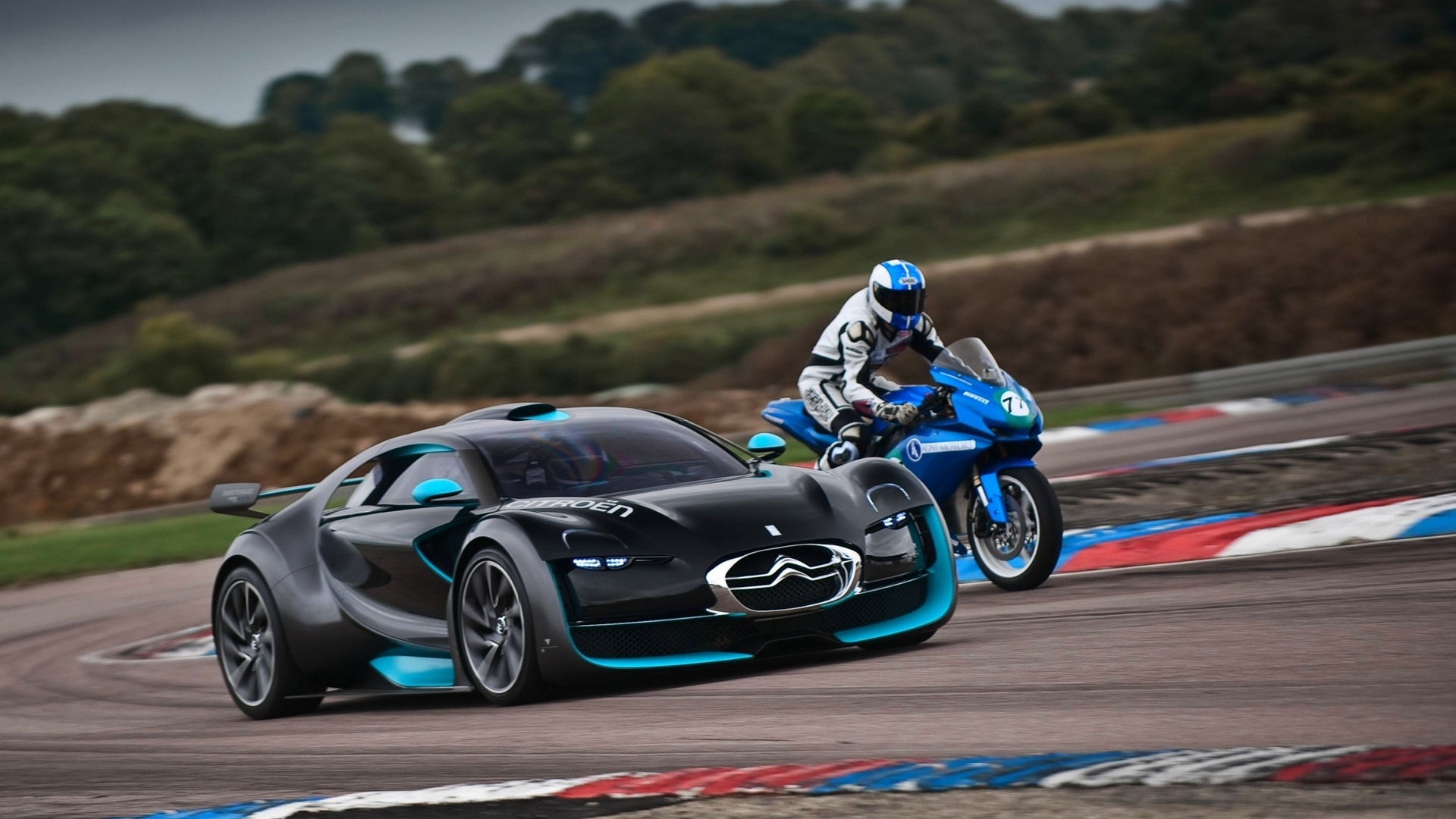 Description: A person riding a motorcycle next to a car on a race track with another person on a motorcycle behind it.