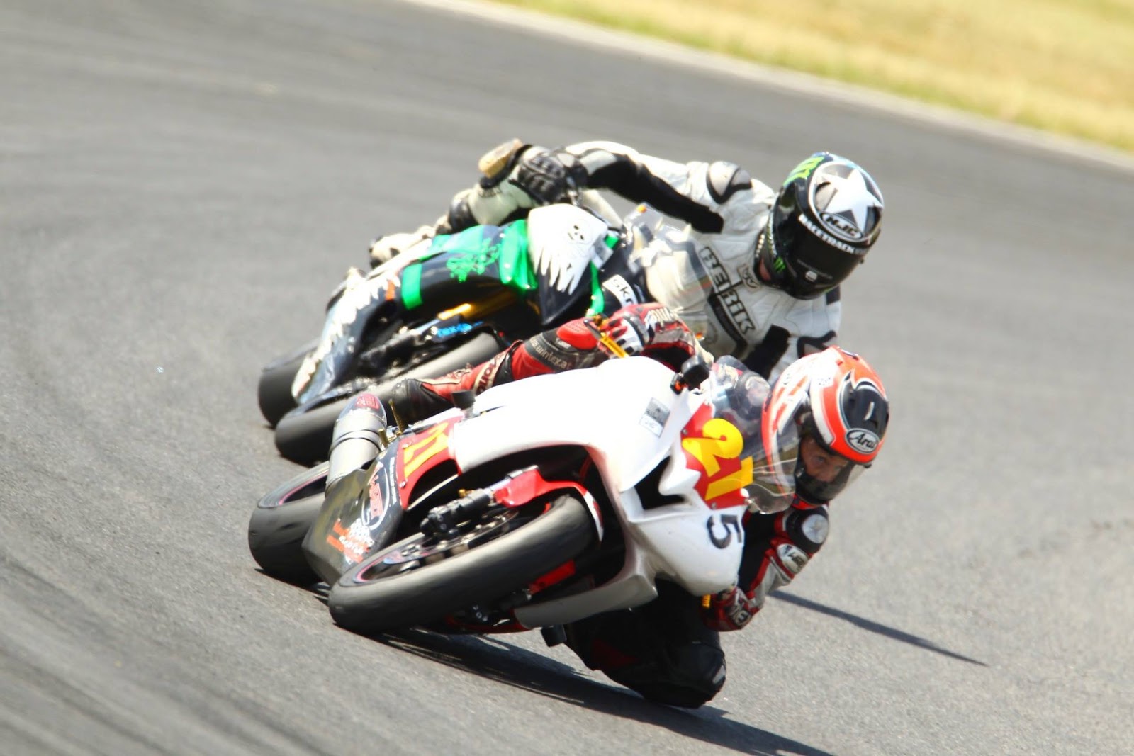 Description: Two people on motorcycles racing on a track together in a race track with grass in the background and grass in the foreground.