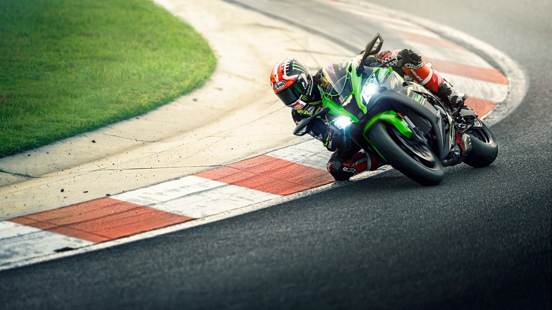 Description: A person riding a motorcycle on a race track with another person on the bike behind him on a motorcycle.