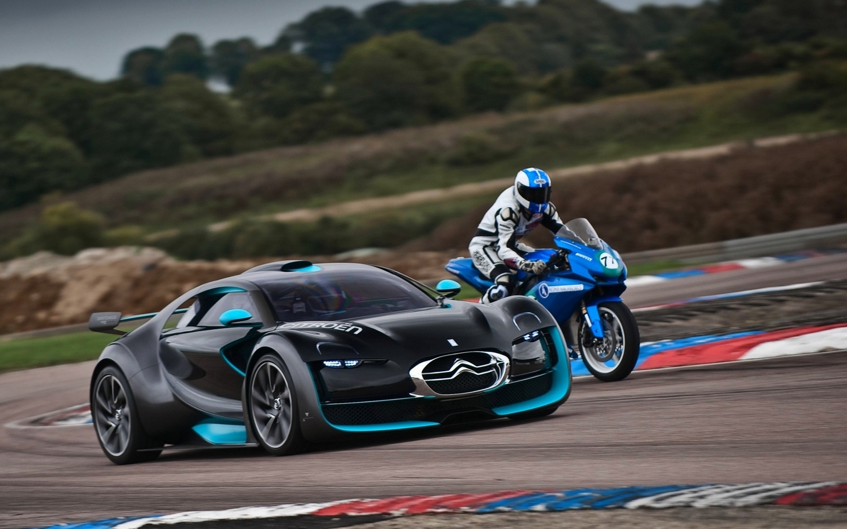 Description: A person riding a motorcycle next to a car on a race track with another person on a motorcycle behind it.