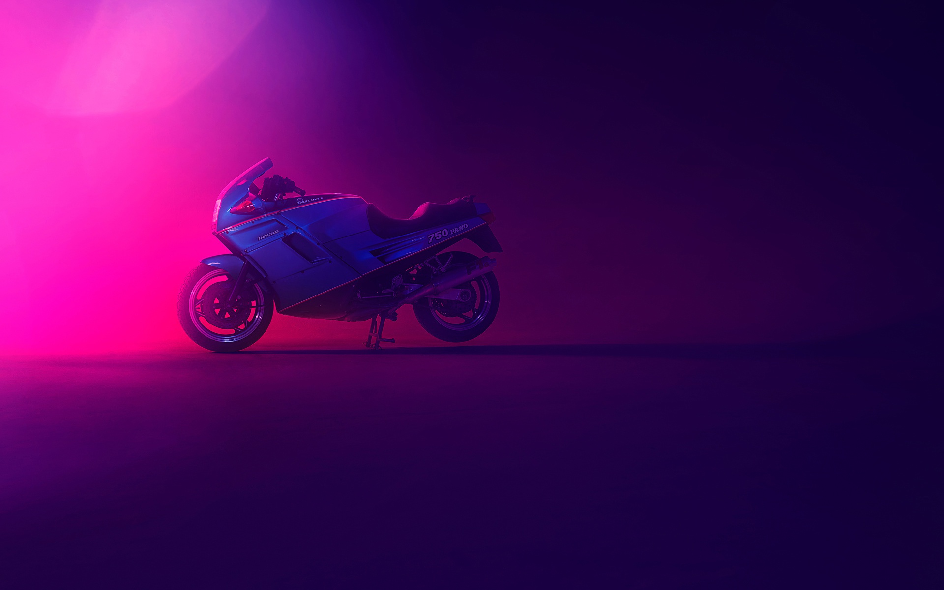 Description: A motorcycle parked in a dark room with a bright light behind it and a purple background behind it with a red and blue light.