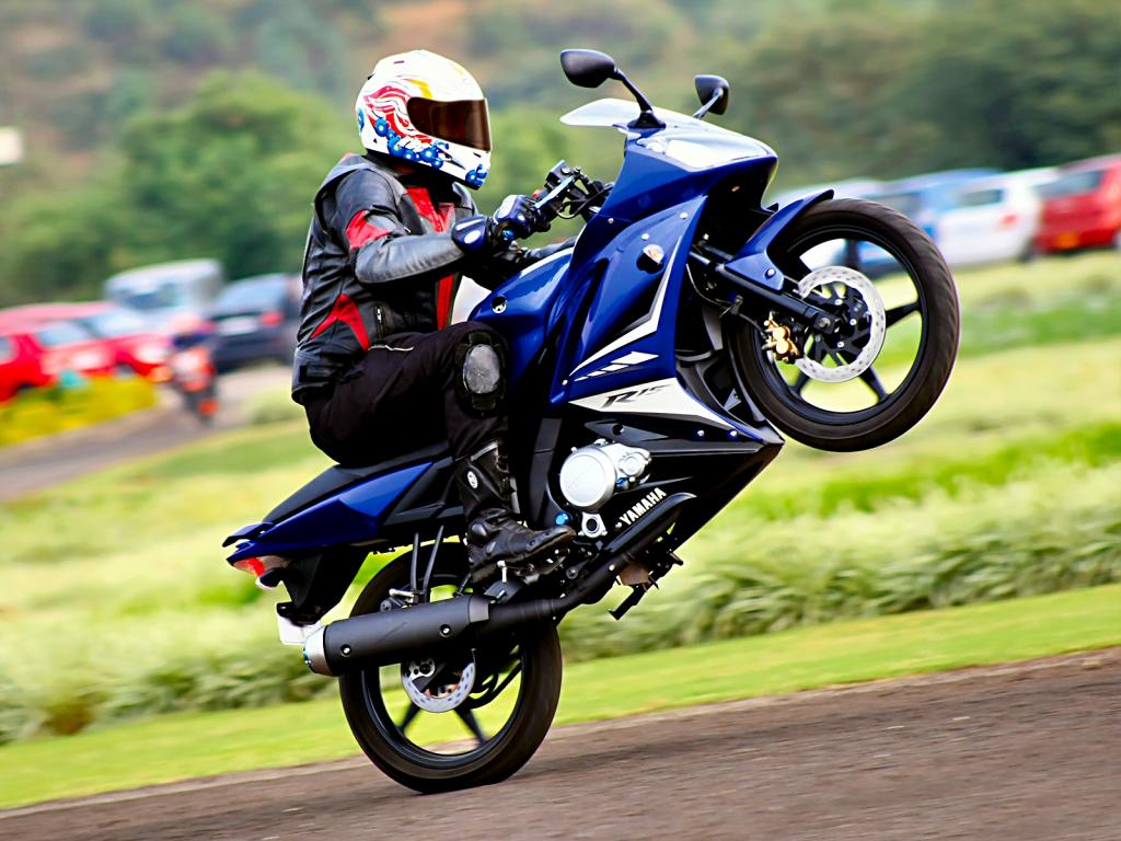 Description: A person riding a motorcycle on a road near a field of grass and trees.