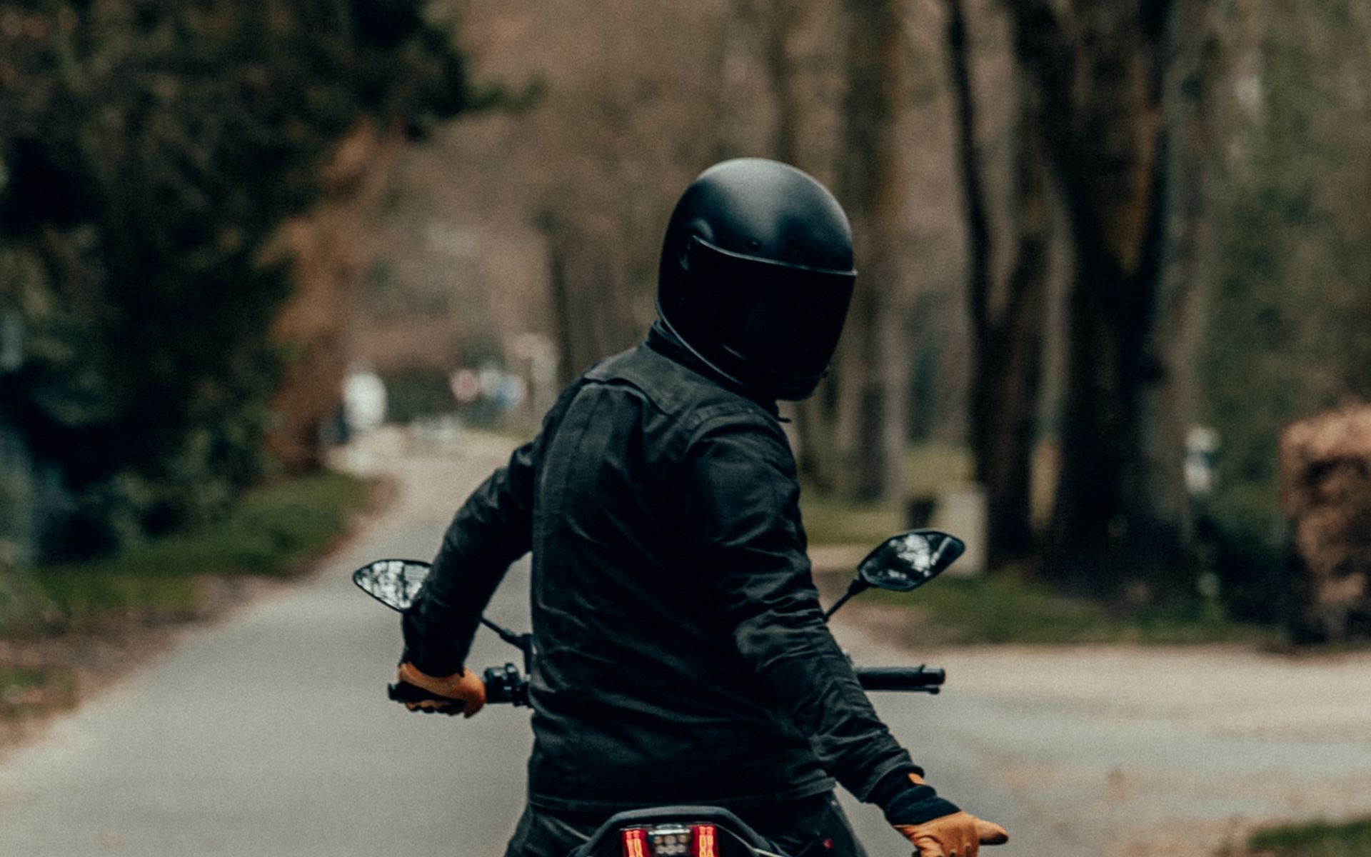 Description: A person riding a motorcycle down a road next to a forest filled with trees and grass on both sides of the road.