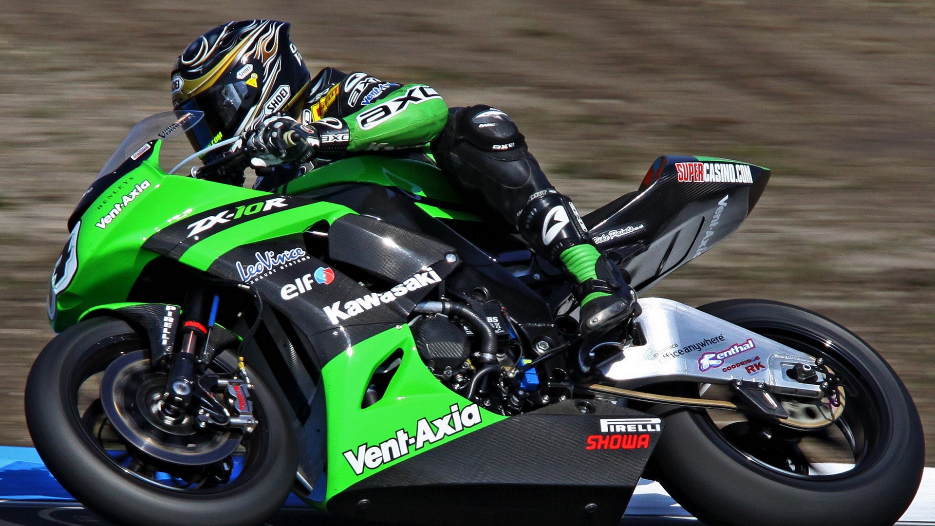 Description: A person riding a motorcycle on a track with a helmet on and a helmet on his head and a helmet on.