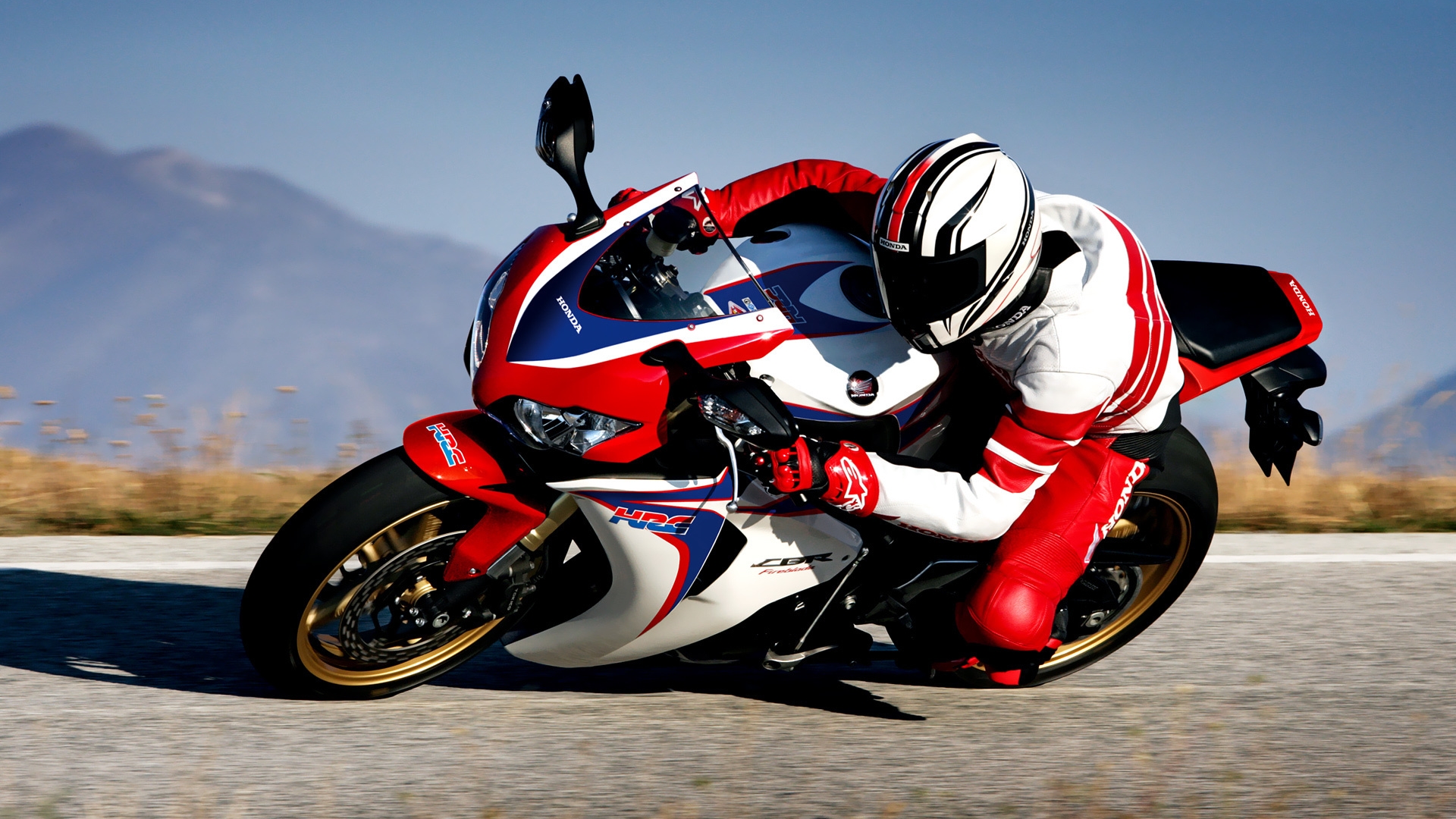Description: A person riding a motorcycle on a road near mountains and grass.