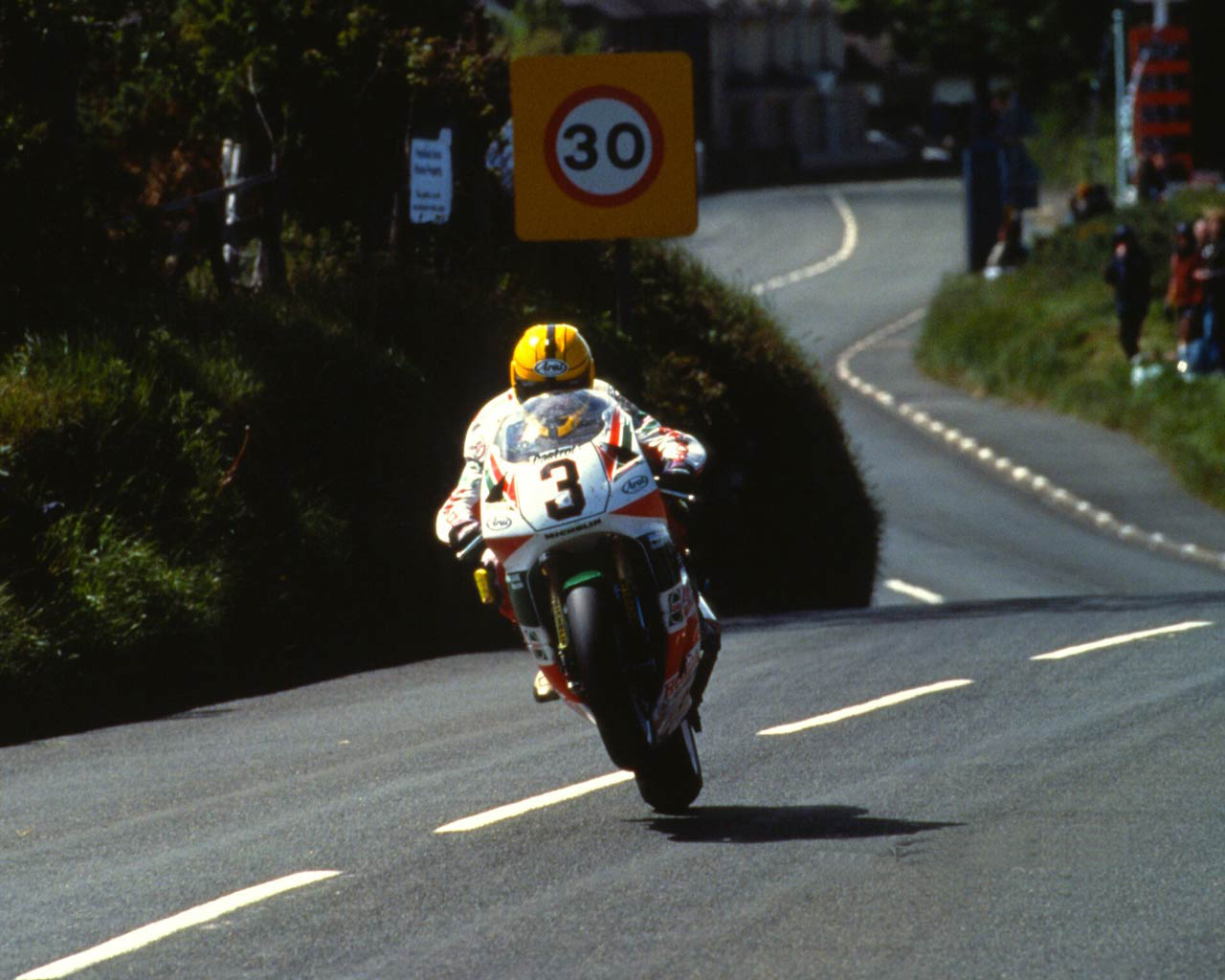 Description: A person riding a motorcycle on a road with a speed limit sign in the background and a speed limit sign in the foreground.