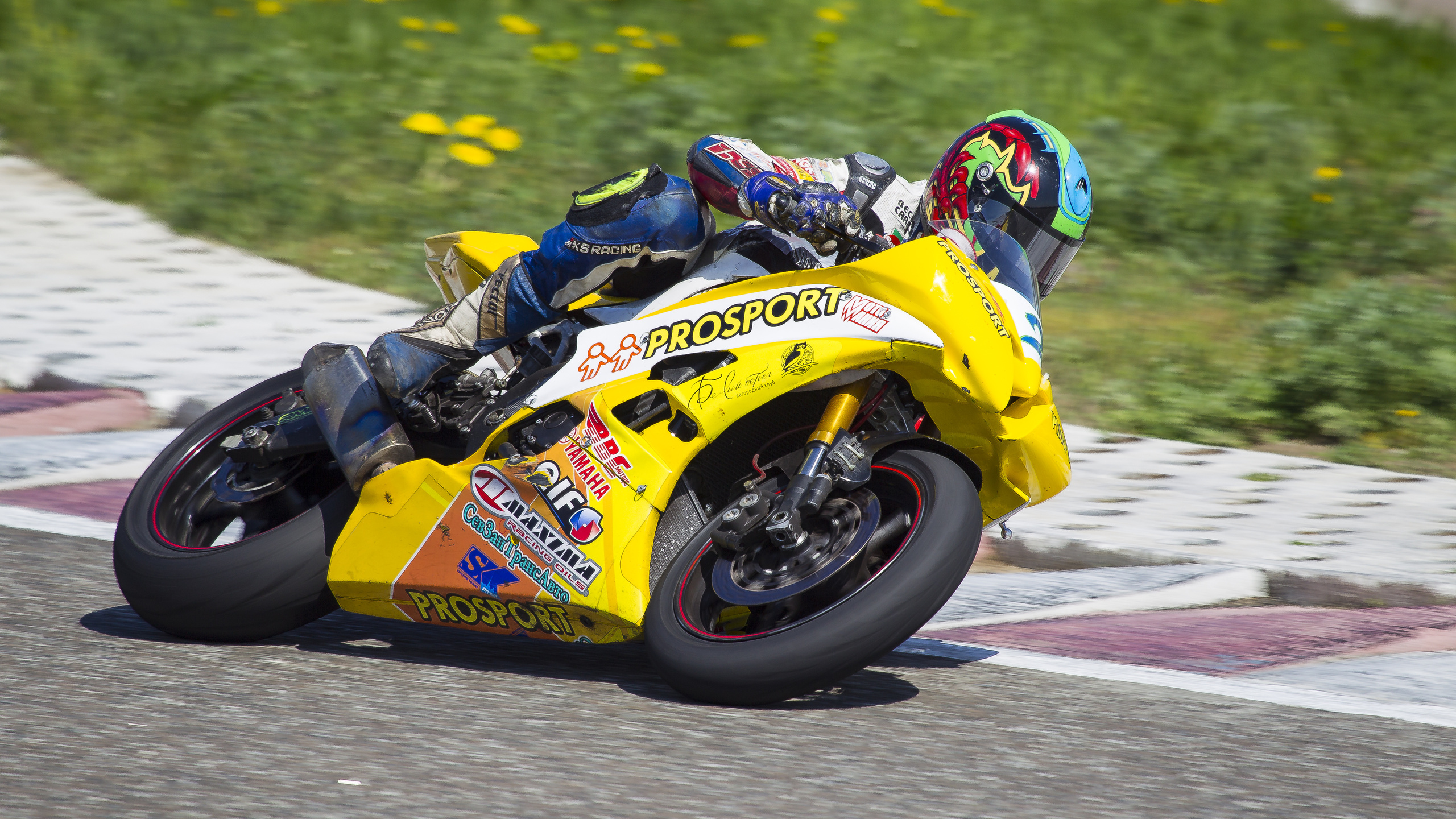 Description: A person riding a yellow motorcycle on a race track with grass and flowers in the background and a yellow and black helmet on.