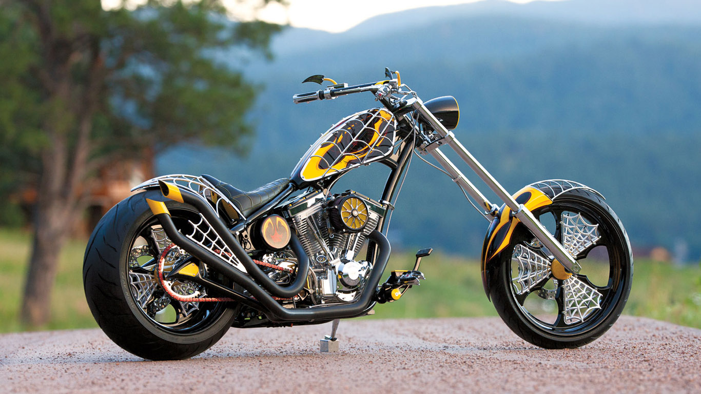 Description: A motorcycle parked on a road near a tree and mountains in the background.