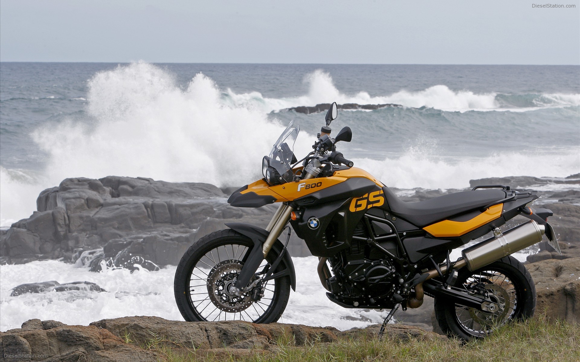 Description: A motorcycle parked on a rocky shore near the ocean with a wave crashing in the background and a person standing on the rocks.