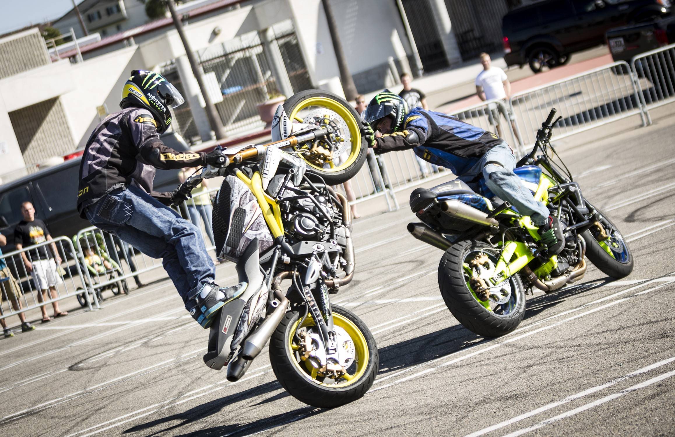 Description: Two people on motorcycles doing tricks in a parking lot with people watching from the stands behind them and a man on the back of the bike.