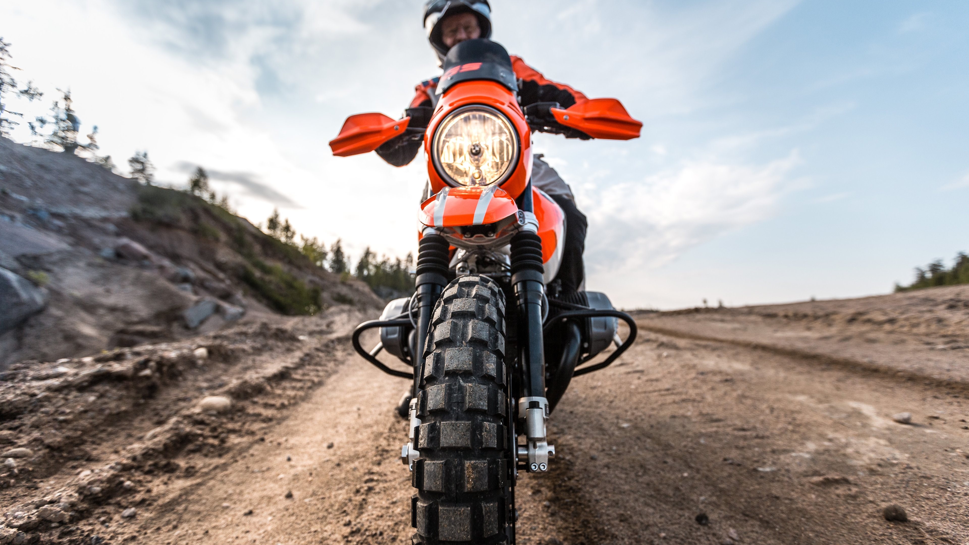 Description: A person riding a motorcycle on a dirt road in the woods and mountains in the background.