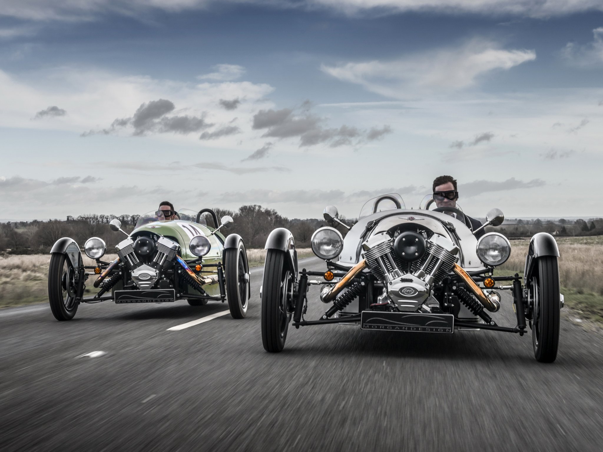 Description: Two men riding motorcycles on a road with grass and trees in the background and a cloudy sky above them.