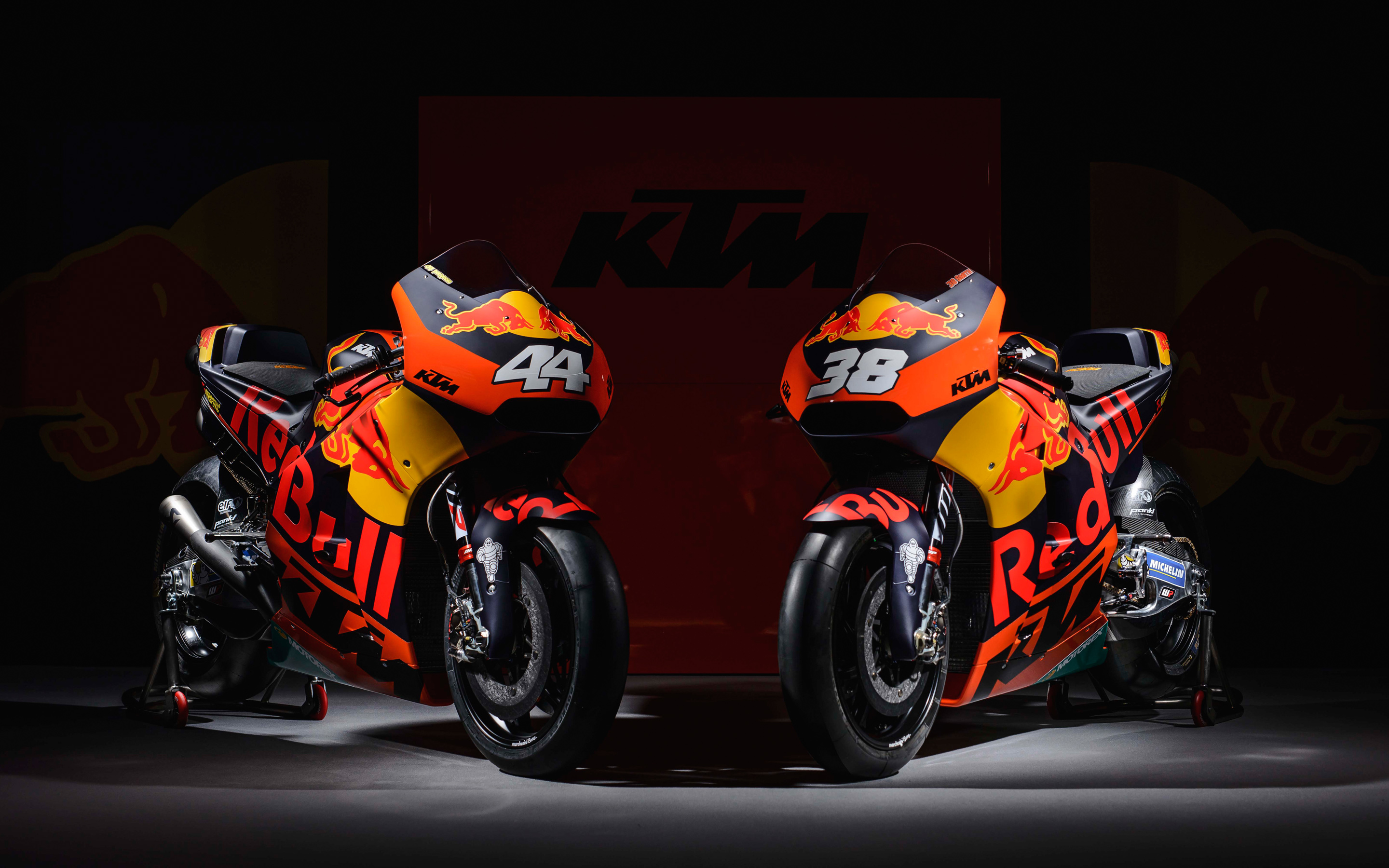 Description: Two motorcycles are parked side by side in a dark room with a red and yellow background and a red and black background.