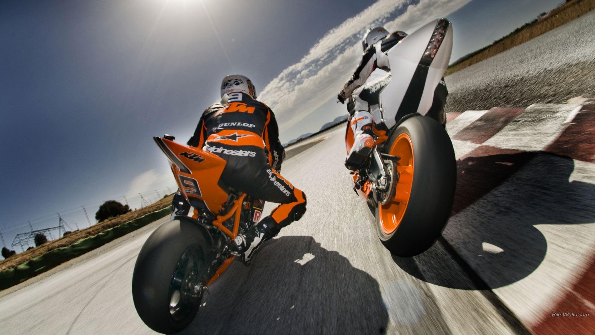 Description: Two motorcycles are racing on a track with a sky background and sun shining on the ground behind them.