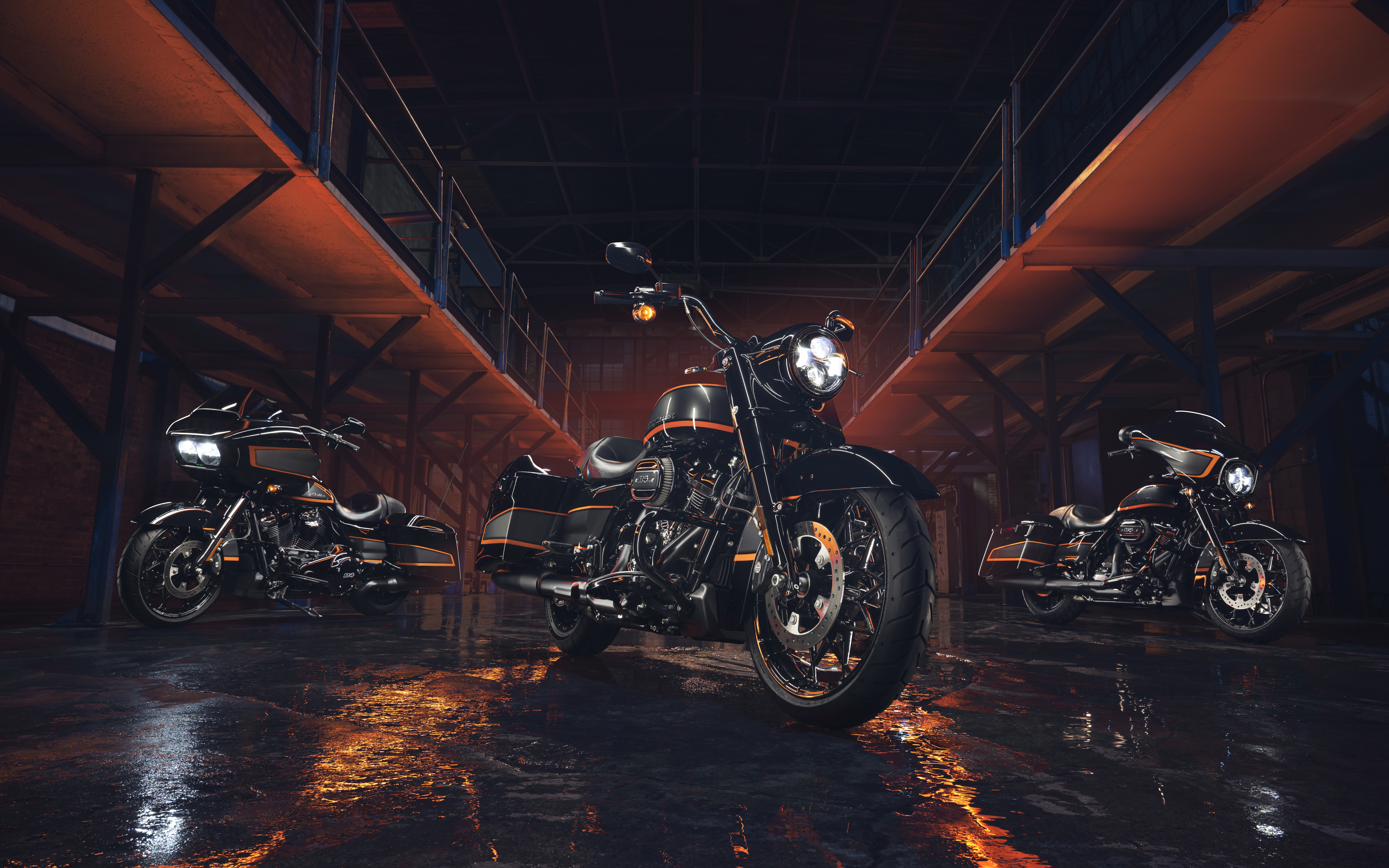 Description: A group of motorcycles parked in a warehouse area at night time.