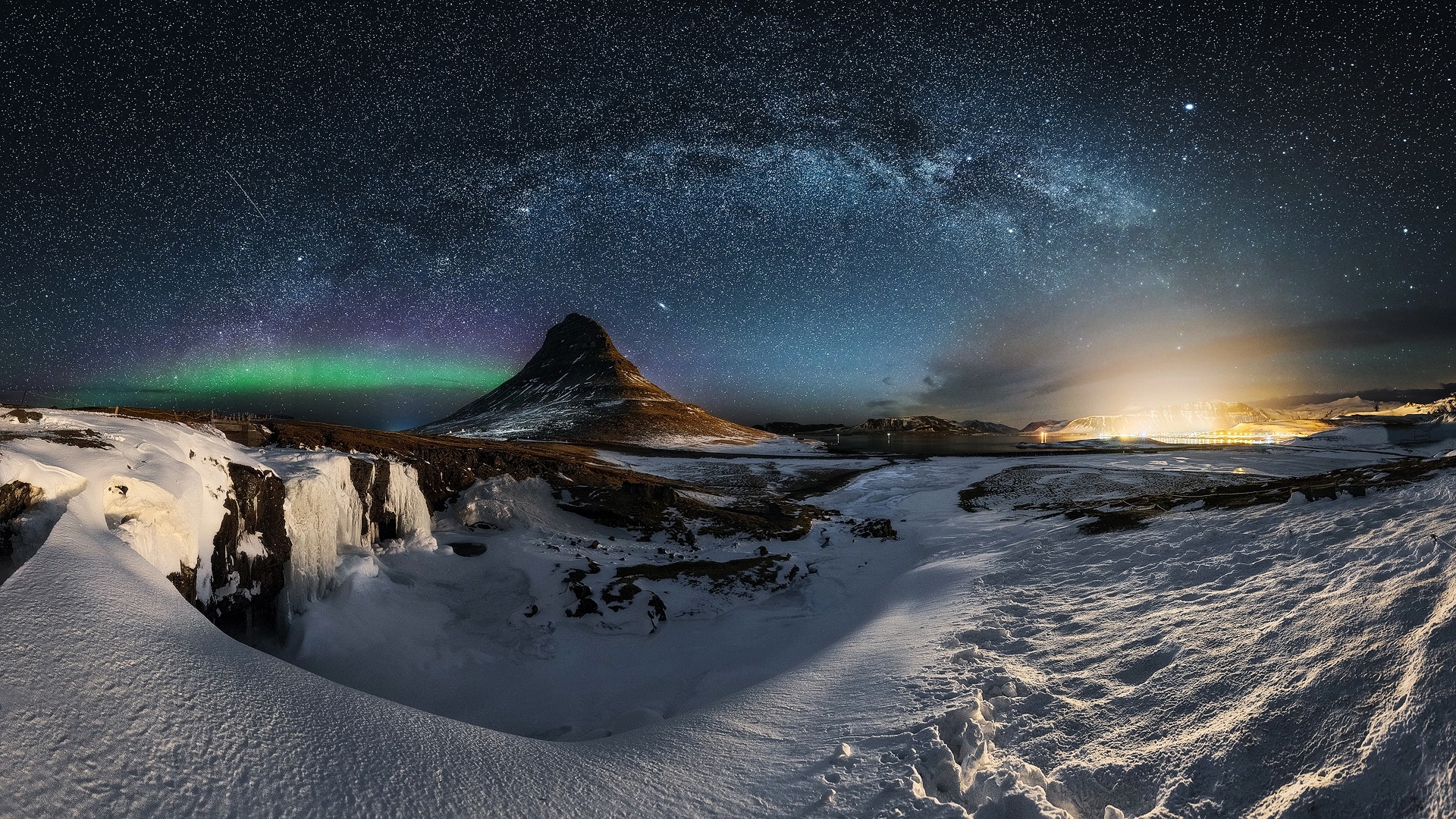 Description: A mountain with a green aurora above it and a sky full of stars above it and a mountain with a green aurora in the distance.