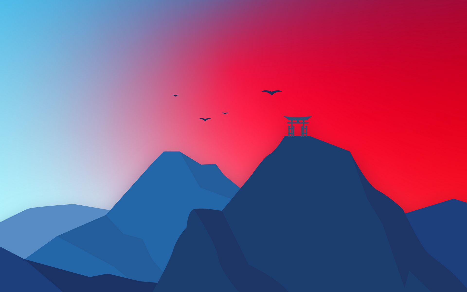 Description: A mountain with a bird flying over it and a red sky in the background with a bird flying over it.
