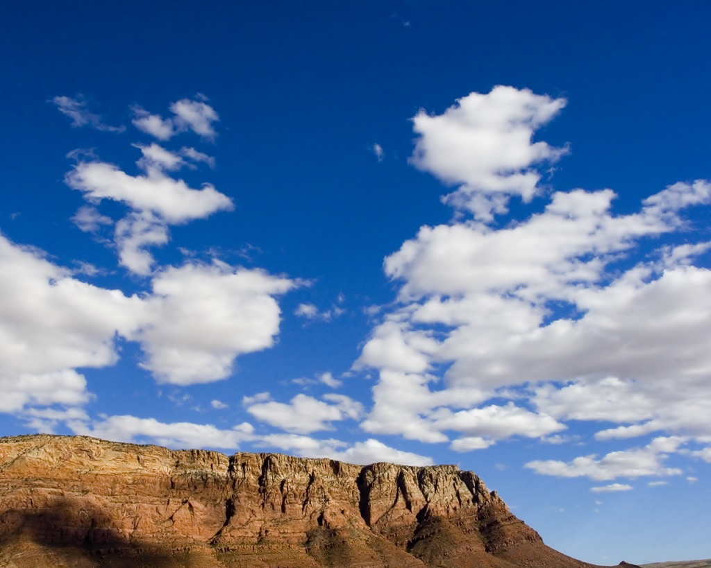 Description: A mountain with a blue sky and clouds above it and a few people on the ground below it and a few people on the ground below it.