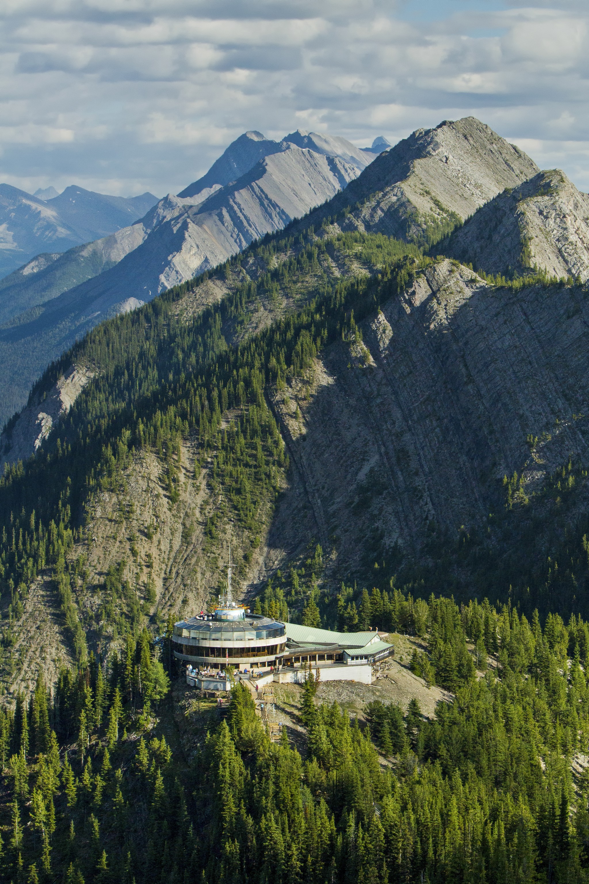 Description: A mountain with a building on top of it and a forest below it with a sky background and clouds.