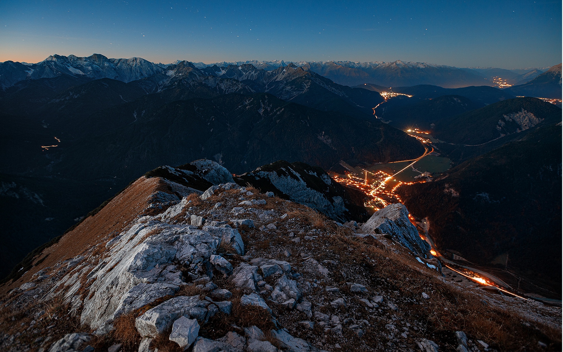 Description: A view of a mountain with a city at night from the top of a mountain with a view of the city lights.