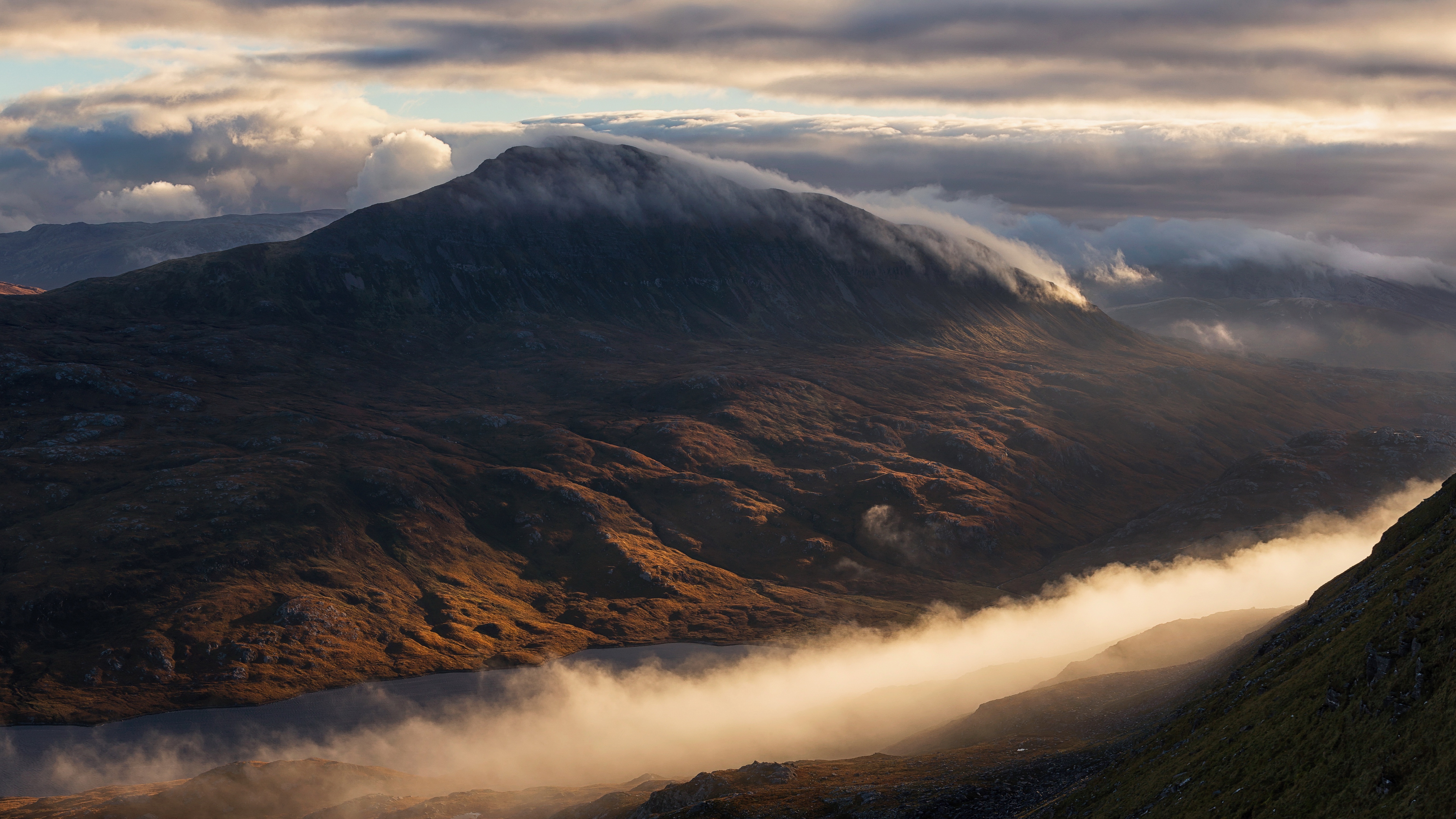 Description: A mountain with a cloud covering the top of it and a river below it in the foreground with a few clouds in the sky.