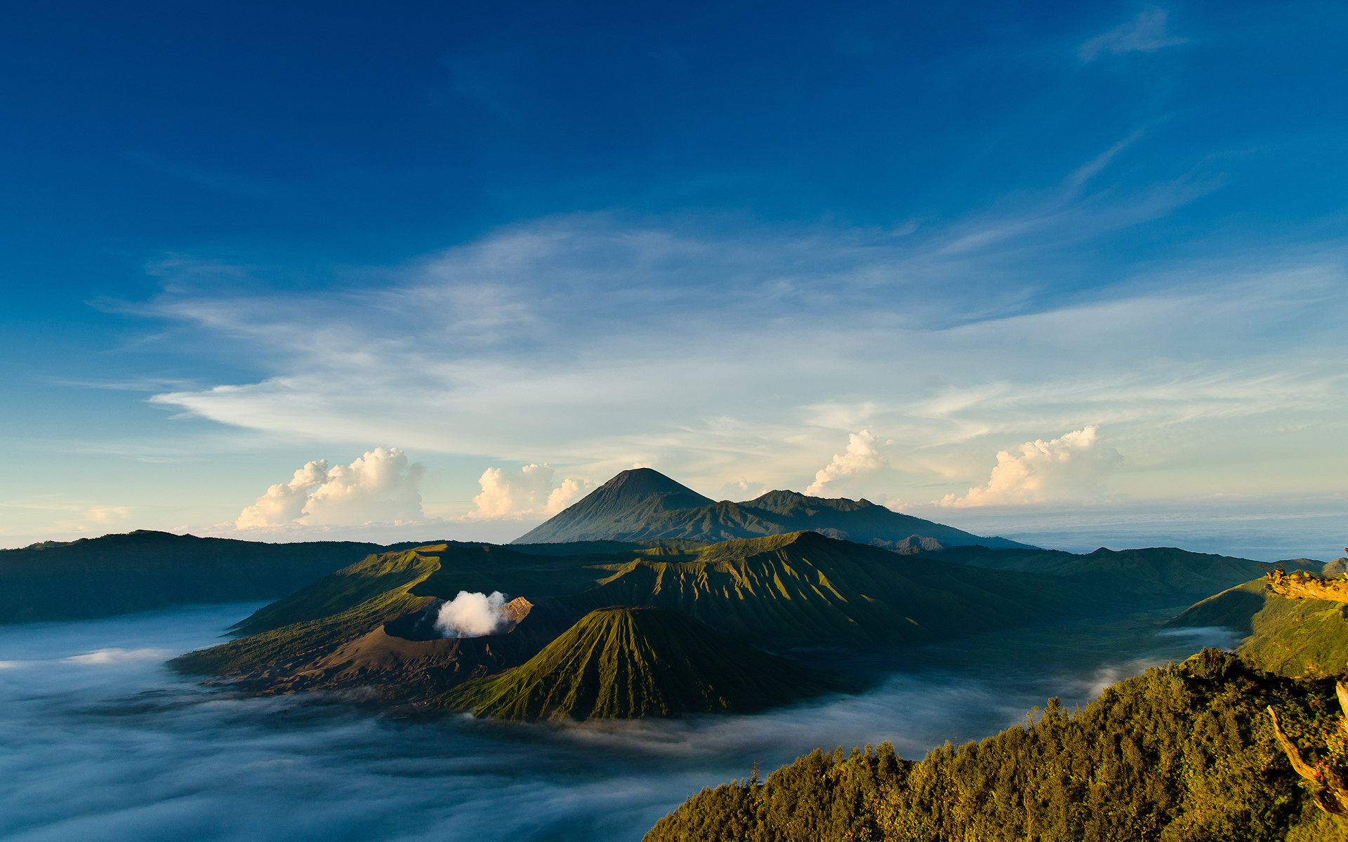 Description: A mountain with a cloud filled sky above it and a few clouds below it and a few hills below.