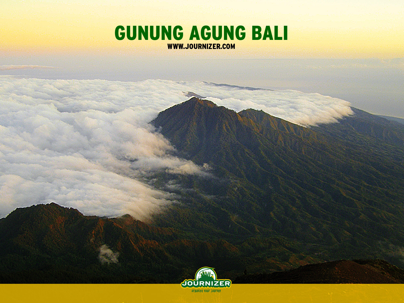 Description: A mountain with a lot of clouds below it and a yellow border around it with the words gunung agung bali.