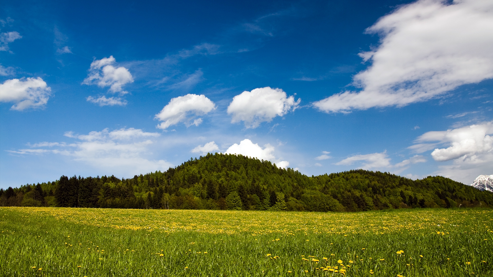 Description: A field with a mountain in the background and clouds in the sky above it and a few yellow flowers in the foreground.