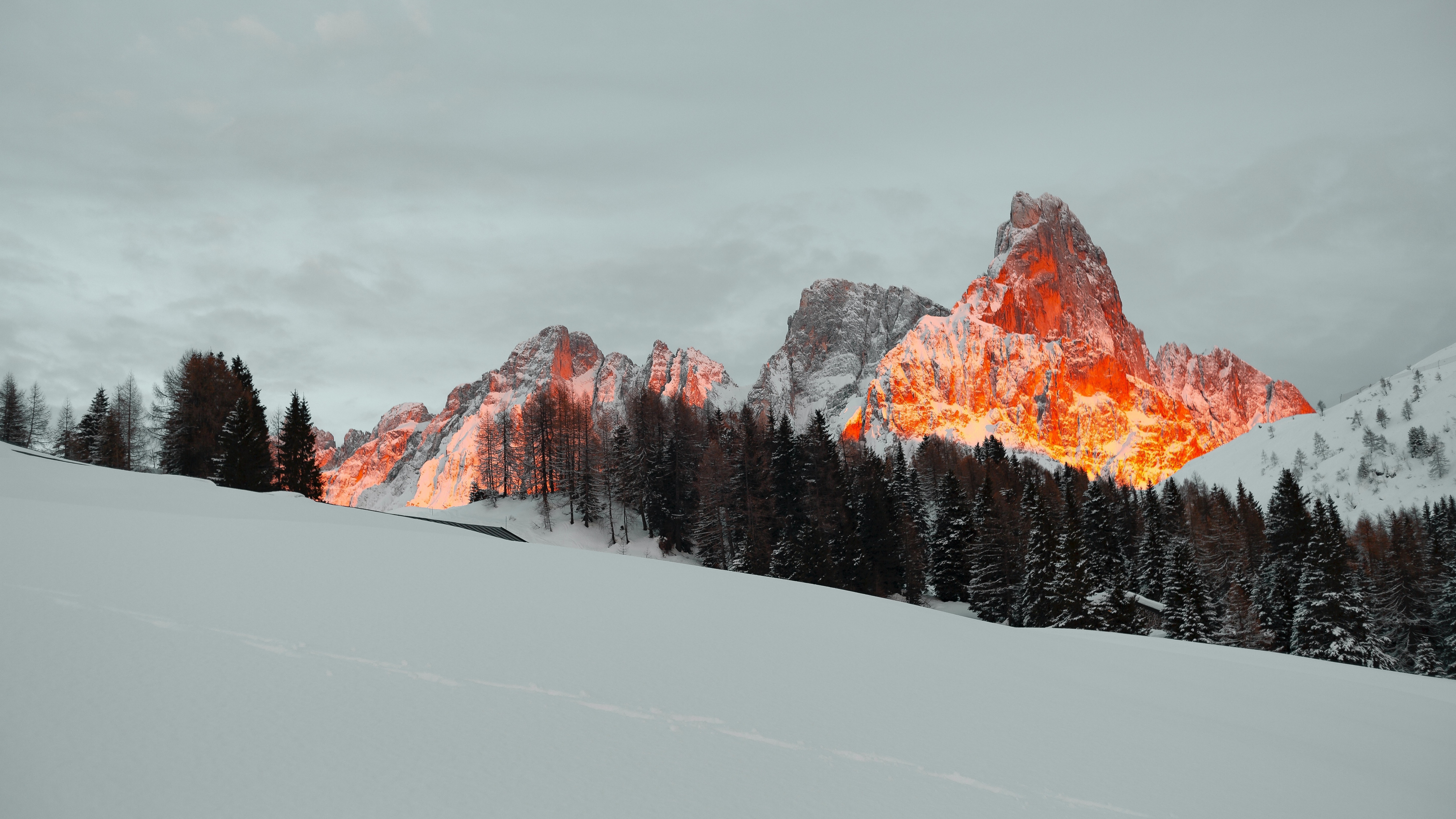 Description: A mountain with a fire in the middle of it and trees in the background with a cloudy sky above.
